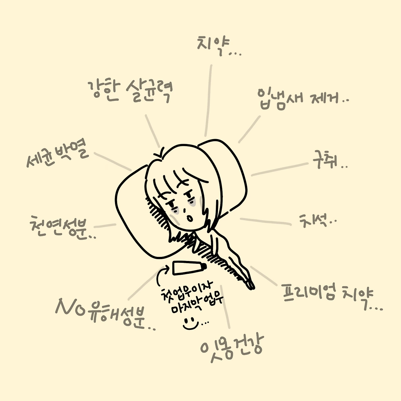 입사한 지 한 달도 안돼서 퇴사를 했습니다. 창피하긴 하지만 당당히 말해요. 잘못한 건 없잖아요~ 혹시 반찬으로 자주 먹는 무말랭이 아시나요? 제가 기가 빨려서 그 무말랭이처럼 되었습니다. 입사해서 처음 맡은 업무는 치약 상품 런칭이였습니다. 상품을 오픈하기 앞서 필요한 카피라이트, 이미지, 디자인 등을 맡아서 기획해야 했어요. 우선 저는 디자이너예요. 기획 업무도 원해서 입사한 건 맞지만 오자마자 치약 런칭이라 부담이었습니다. 그러다 보니 주어진 시간 또한 저에게는 짧게 느껴졌죠.. 함께하는 동료들에게 도움을 청할까도 했지만 다 바쁘다 보니 눈치가 보였어요. 결국 말을 삼키고 혼자 끙끙 앓아가며 야근과 주말근무를 했습니다. 치약을 모르는 상태에서 하려니 아무것도 안 나오는 게 당연했습니다. 성분 공부를 하며 특징을 파악했고, 성분 공부가 끝났으면 이제 공감할 수 있는 카피들을 뽑아내야 하는데 이게 쉬운 게 아니였습니다.