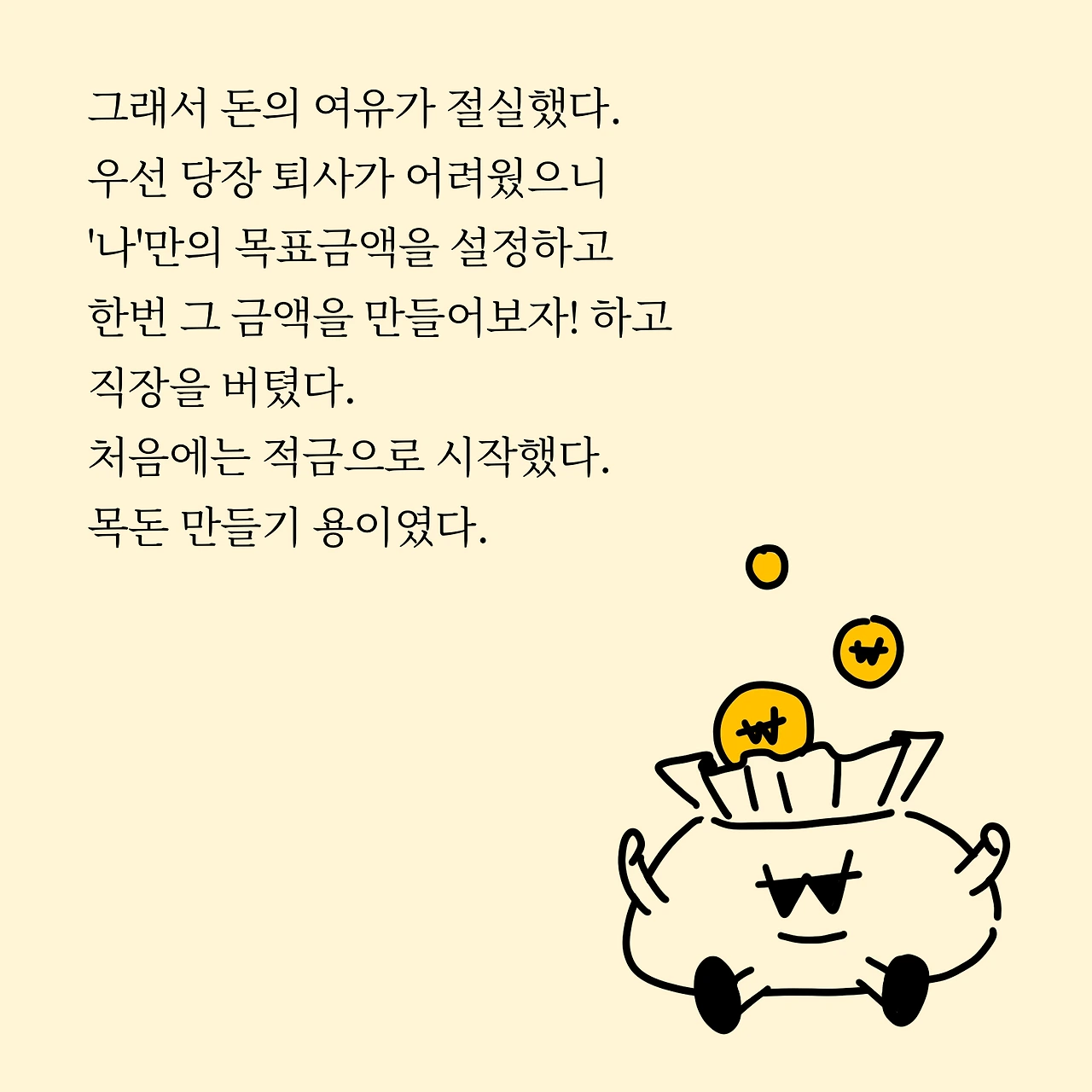 첫 직장생활 1년을 경험하며 알았습니다. 돈 여유가 있어야 퇴사도 마음대로 할 수 있다는 것을요. 저는 제가 쉬고 싶을 때 쉬기 위해서 돈을 모으기 시작했어요. 처음에는 예, 적금밖에 몰랐고 우선 목돈을 모으자!라는 생각에 꼬박꼬박 적금했어요. 뭔가 더 긴장을 해야 돈을 아낄 거 같아 자유적금보다는 정기적금을 택했습니다. 그러다 보니 쓸 때 쓰고 안 쓸 때는 안 쓰는 습관이 생겼어요.