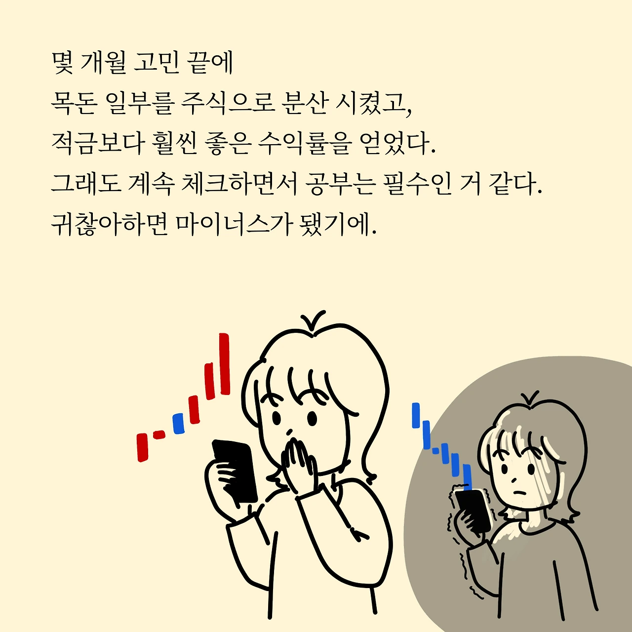 그렇게 몇 년을 하고 나니 목돈이 생겼고, 그 목돈은 저에게 더 소중한 아이들이었습니다. 직장 스트레스와 맞바꾼 제 자산이었으니까요. 이 소중한 돈들이 저는 더 성장했으면 좋겠다 생각했고, 적금 다음 플랜으로 예금과 주식으로 분리시켰습니다. 주식 초보 주린이었기에 주식에 모든 걸 투자하기에는 과한 욕심이라 생각했어요.