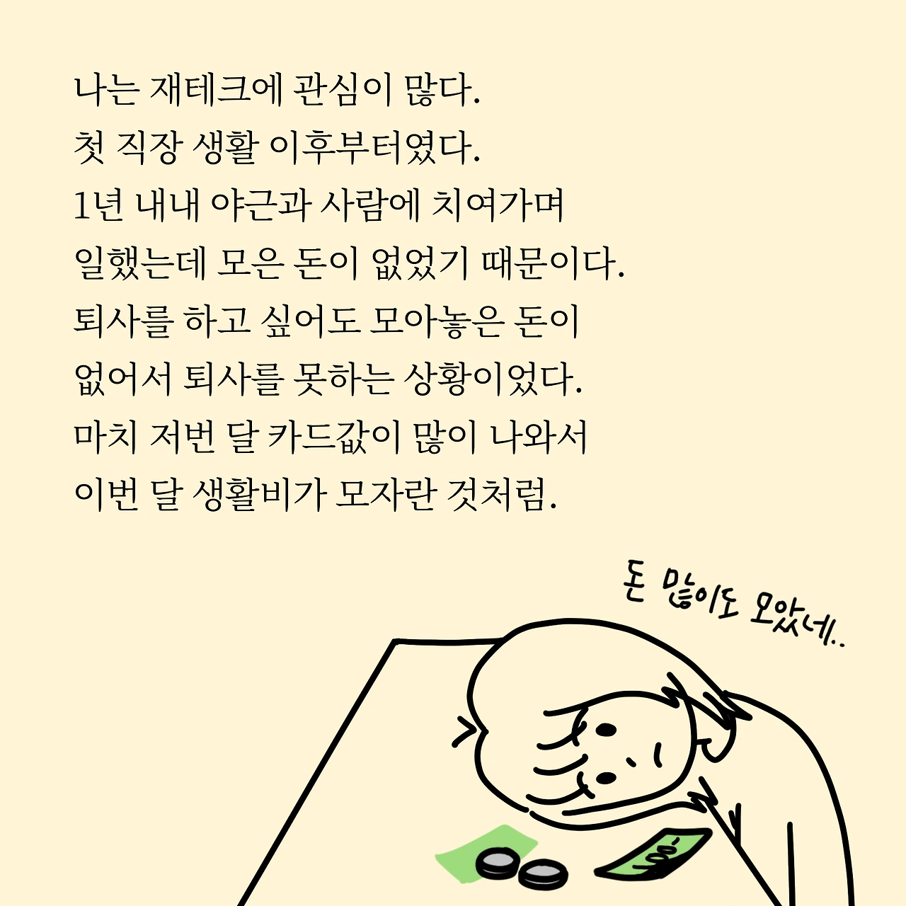 저는 주식에 자산의 10% 투자하고 있습니다. 주식을 시작한 지 1년 다되어가는데 이 과정 속에는 플러스, 마이너스 경험이 있습니다. 그 경험 속에서 저와 맞는 방법이 점점 자리를 잡고 있는 거 같습니다. 각자에게 맞는 직장생활이 있듯이 재테크도 그런 거 같아요. 완벽한 직장 탈출이 되는 그날까지 모두 파이팅입니다!