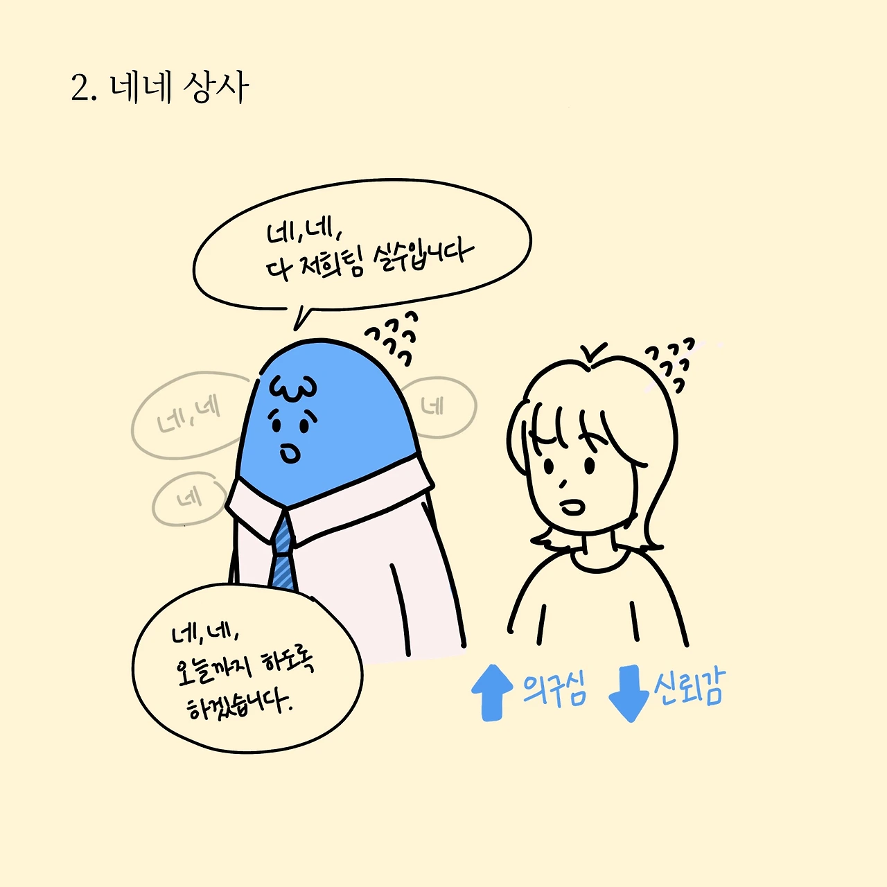자신의 주관보다는 회사 일이라면 '네, 네'하는 상사입니다. 상사에 대한 의구심은 늘고 신뢰감은 떨어지는 부작용이 있습니다. 객관성이 떨어지는 네, 네 니까요. 동시에 업무가 한가득 쌓여있는 상황이 올 수도 있어요. 업무 속도 빠르고 상사와 발맞춰 네, 네만 한다면 무난하게 다닐 수도 있을 거 같습니다. + 야근