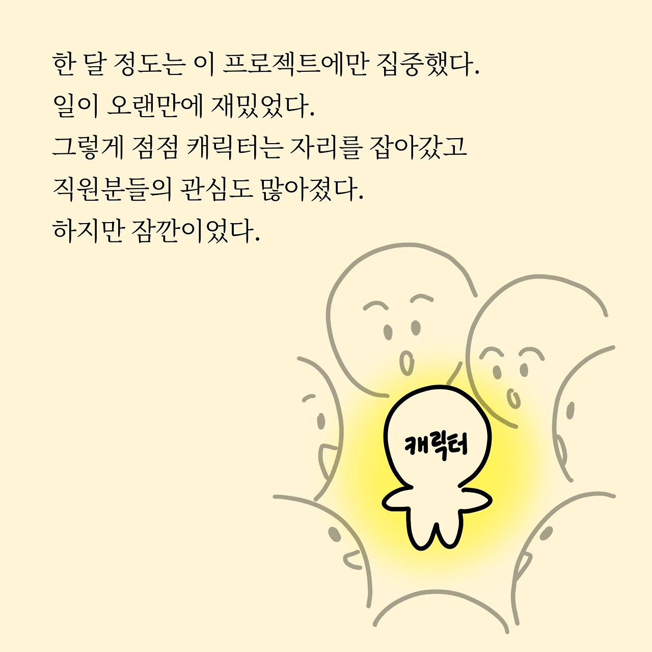 한 달 정도는 이 프로젝트에만 집중했다. 일이 오랜만에 재밌었다. 그렇게 캐릭터는 점점 자리를 잡아갔고 직원분들의 관심도 많아졌다. 하지만 잠깐이었다.
