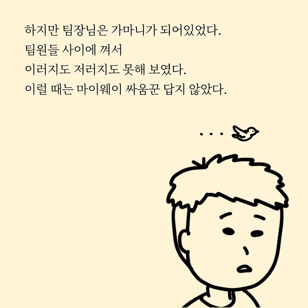 정작 나서야 할 때 나서지 못하는 팀장님을 보고 말았습니다. 저는 답답해서 속이 다 타버렸습니다. 당시 하고 싶은 말이 잔뜩이었지만 '팀장도 가만히 있는데 내가 어떻게 말해?'라는 생각에 큰 부담이었어요. 결국 말을 삼켰습니다. 직장에서 말삼키기는 아주, 자주, 많이 있습니다.