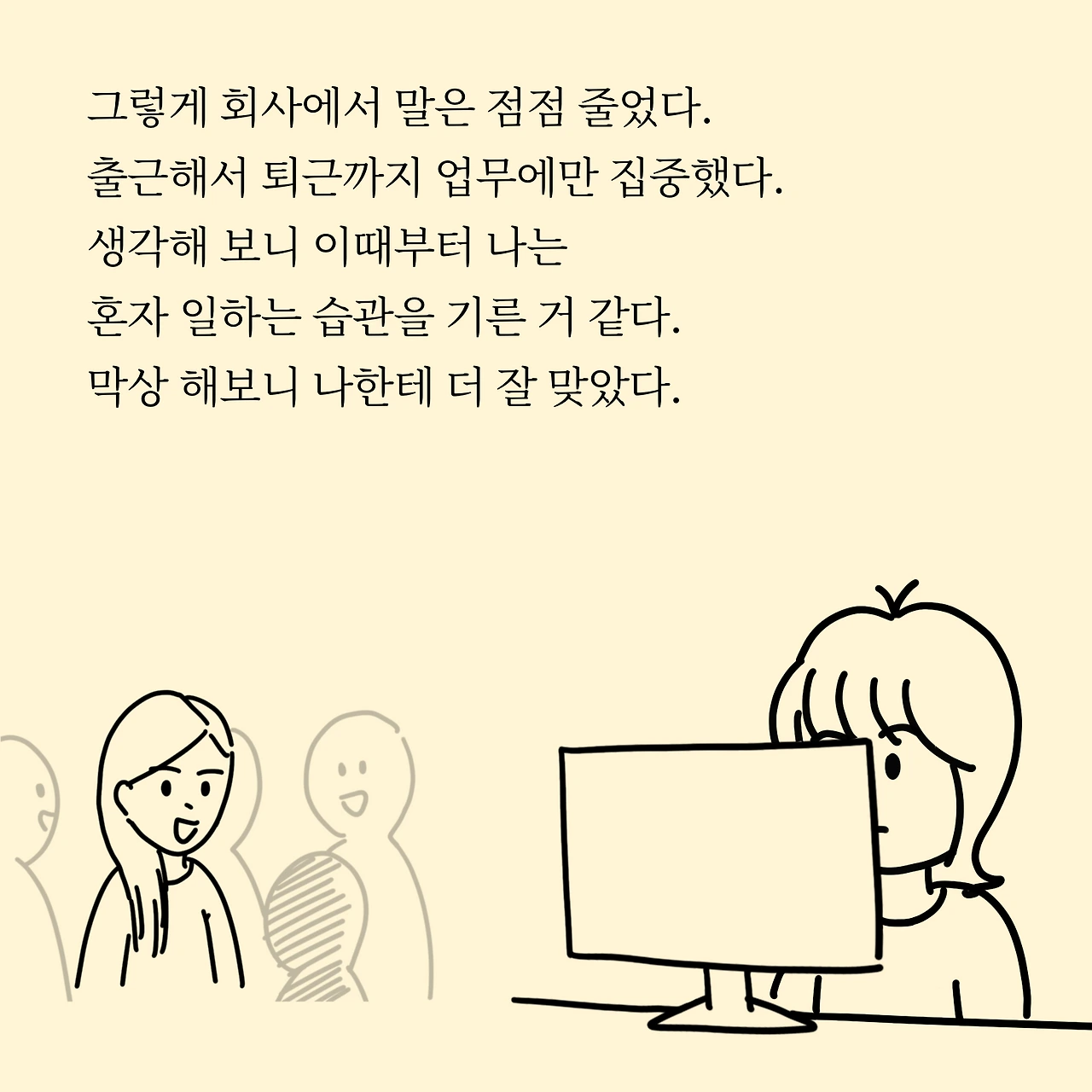 그렇게 회사에서 말은 점점 줄었다. 출근해서 퇴근까지 업무에만 집중했다. 생각해 보니 이때부터 나는 혼자 일하는 습관을 기른 거 같다. 막상 해보니 나한테 더 잘 맞았다.