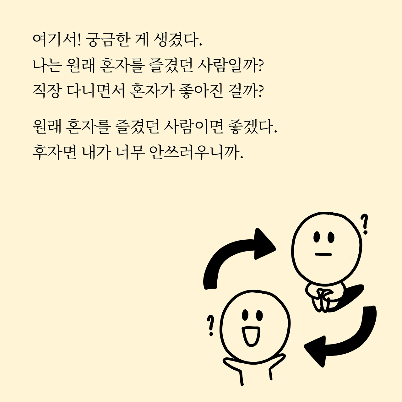 여기서 궁금한 게 생겼다. 나는 원래 혼자를 즐겼던 사람일까? 직장 다니면서 혼자가 좋아진 걸까? 원래 혼자를 즐겼던 사람이면 좋겠다. 후자면 내가 너무 안쓰러우니까.