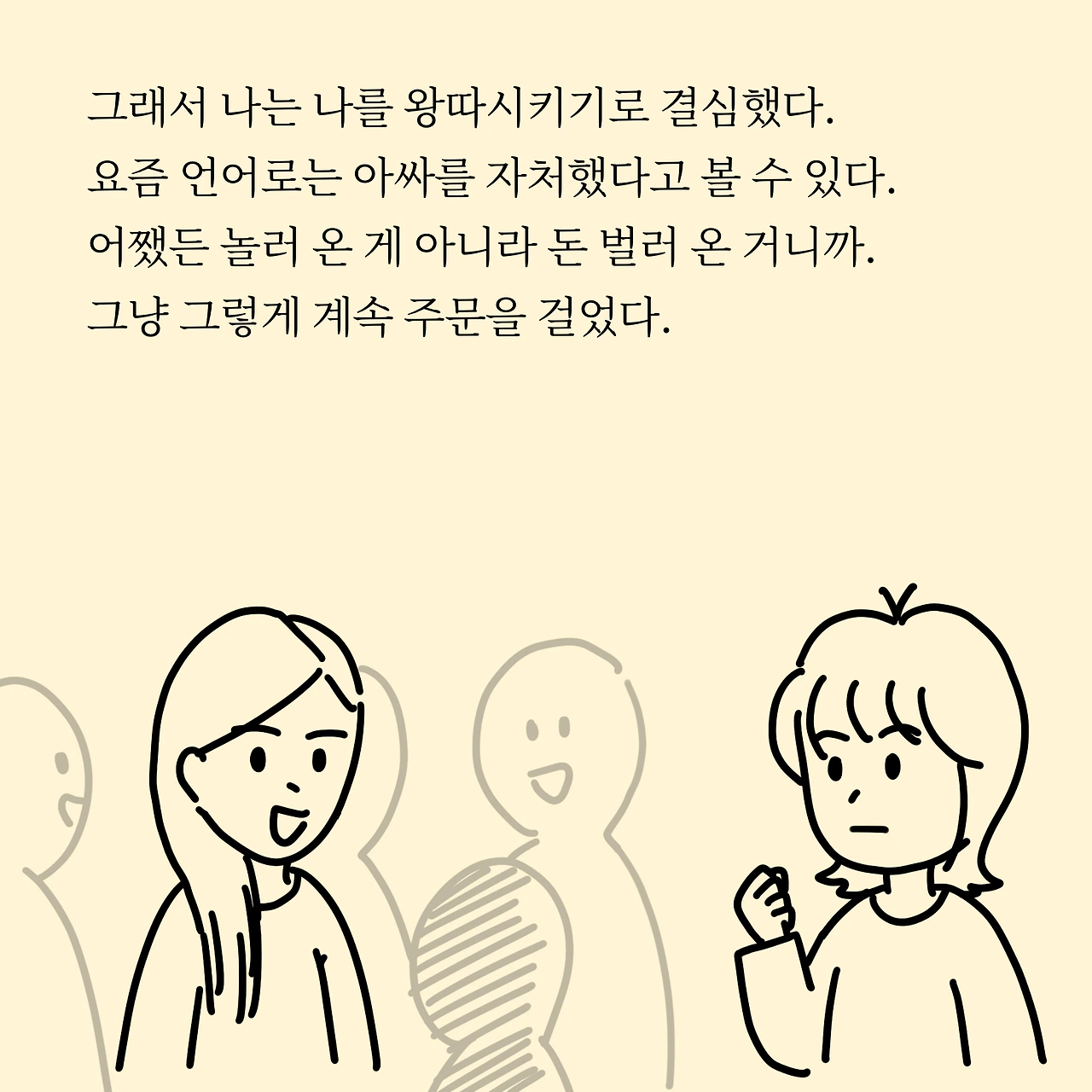 그래서 나는 나를 왕따 시키기로 결심했다. 요즘 언어로는 아싸를 자처했다고 볼 수 있다. 어쨌든 놀러 온 게 아니라 돈 벌러 온 거니까. 그냥 그렇게 계속 주문을 걸었다.