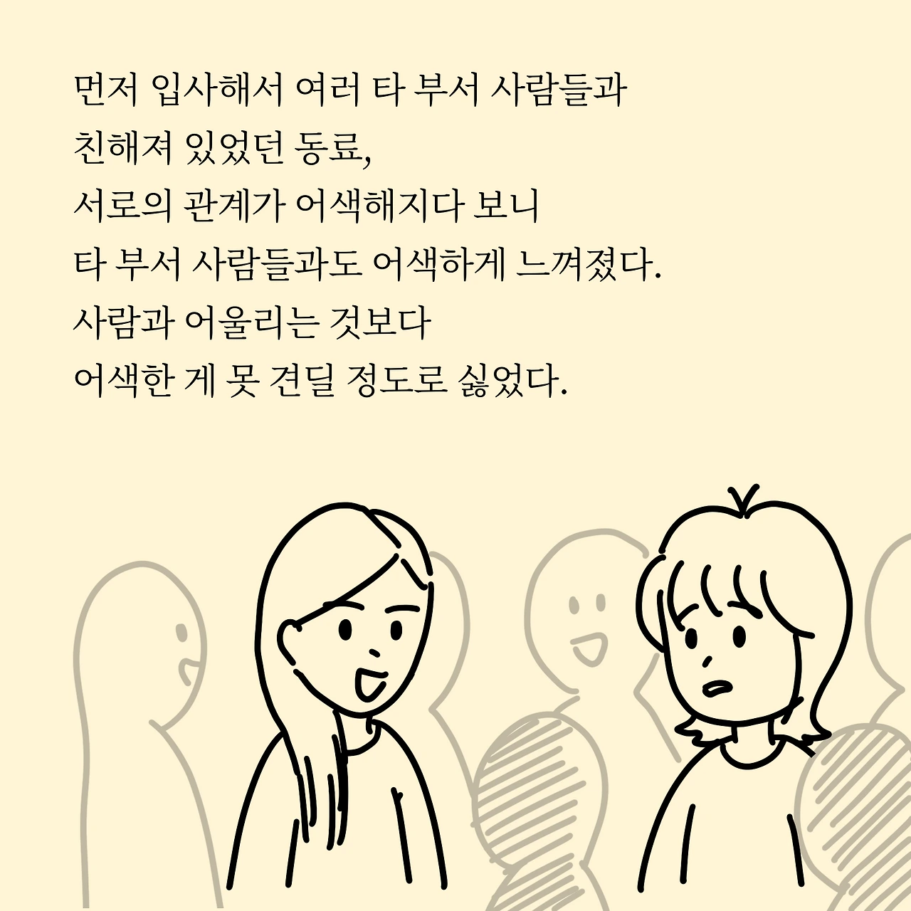 먼저 입사해서 여러 타 부서 사람들과 친해져 있었던 동료, 서로의 관계가 어색해지다 보니 타 부서 사람들과도 어색하게 느껴졌다. 사람과 어울리는 것보다 어색한 게 못 견딜 정도로 싫었다.