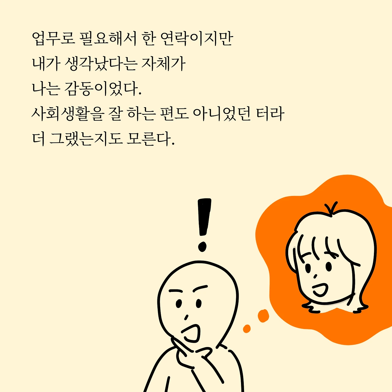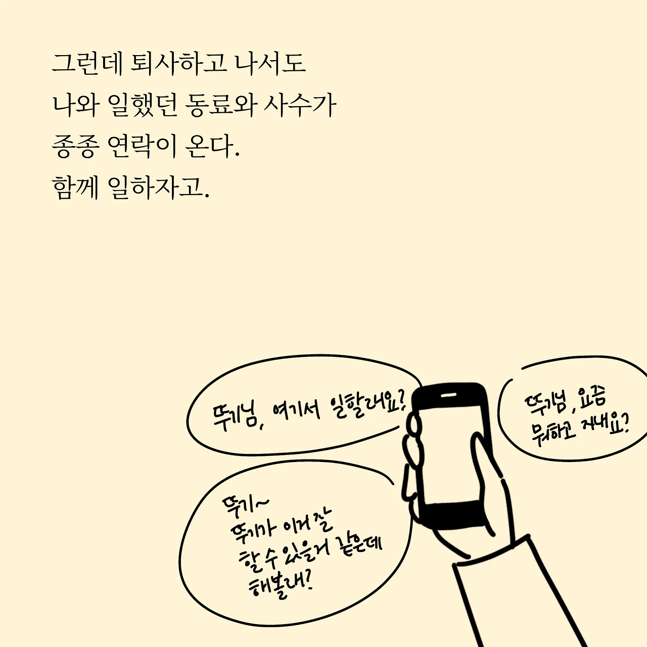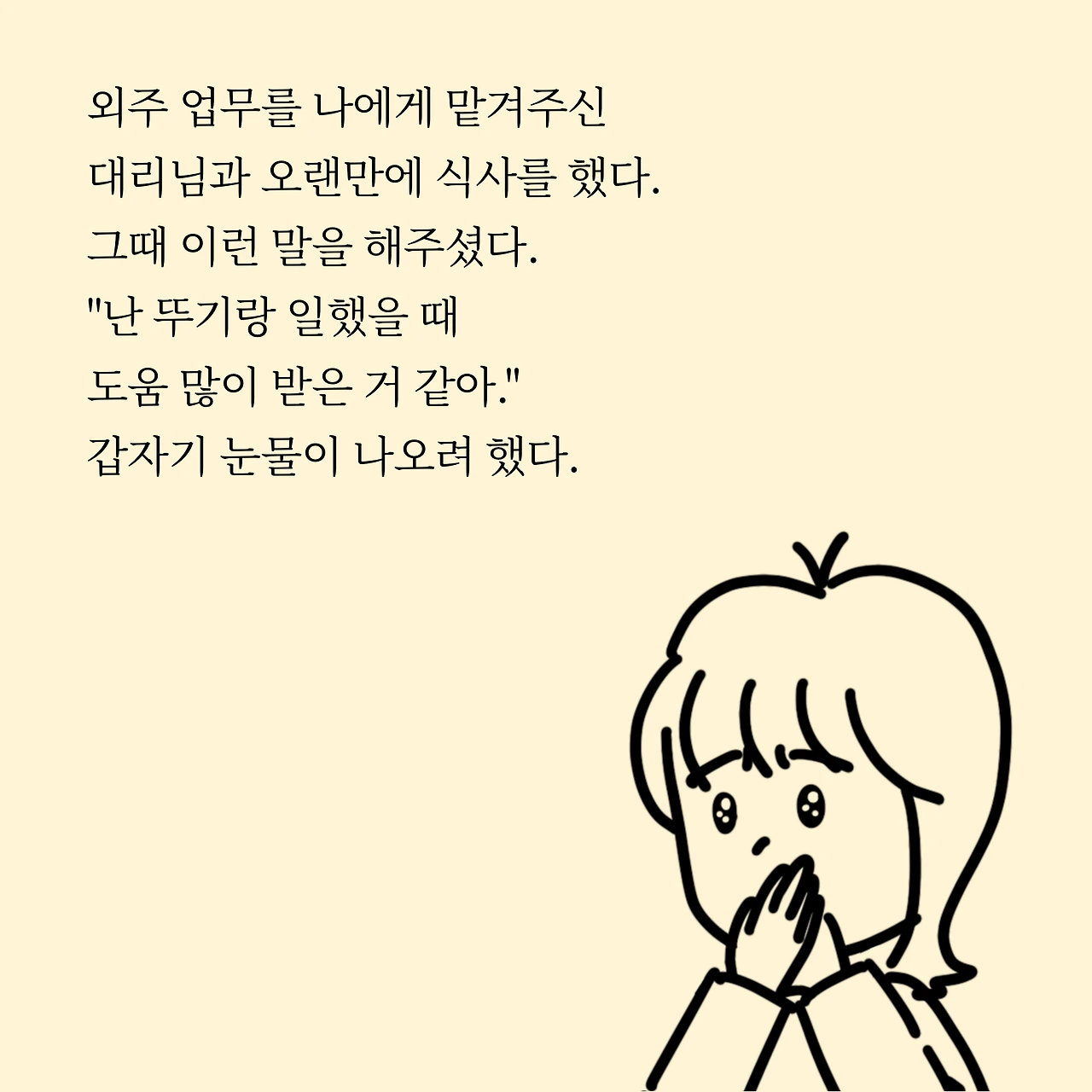 이런 직원은 사회성이 부족한 사람이라고 스스로 정의를 내려서 그런 거일까요? 퇴사를 하고도 함께 일하자는 연락에 더 큰 감동이 밀려오는 요즘입니다. 생각지도 못했던 일이었거든요.