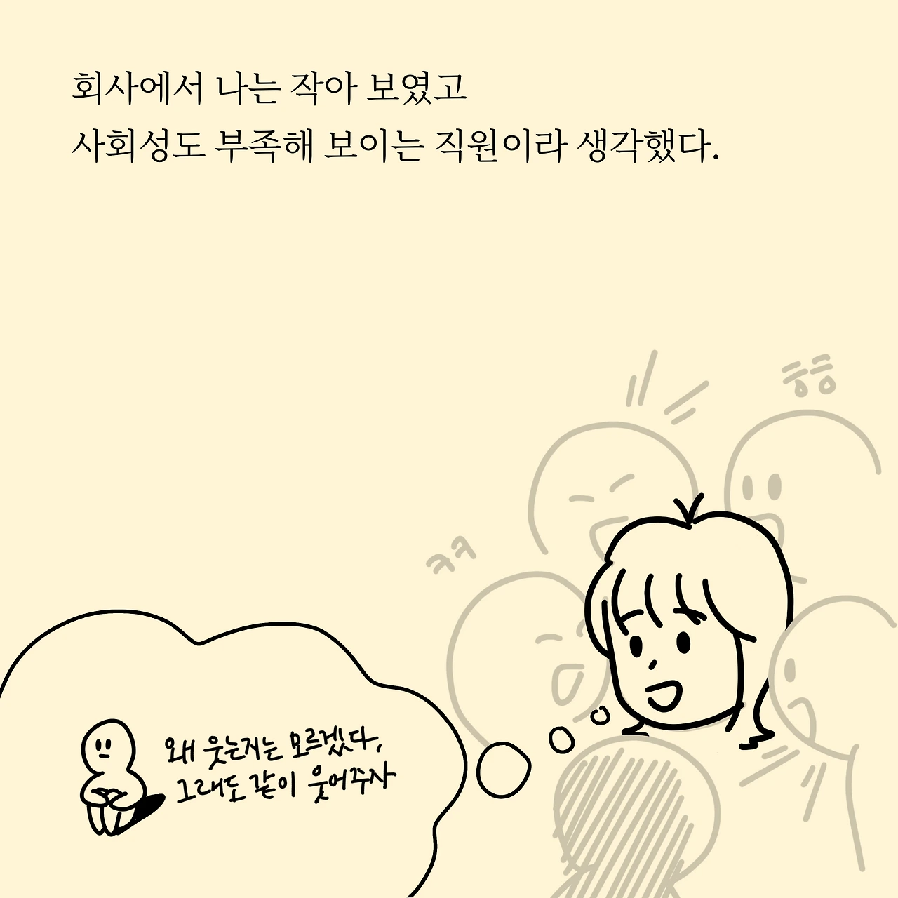 회사에서 저는 한없이 작아 보였고 사회성이 부족해 보인다 생각했어요. 웃어도 어색해 보이고, 동료들의 말에 공감해주는 것도 어색해 보이고, 모든 상황이 어색한 저였습니다. 그 어색함이 지속되니 스트레스로 다가왔고, 여러 사람과 함께 있으면 에너지를 받는 게 아닌 뺏기는 느낌을 받았습니다. 그래서 제가 제일 잘하는 게 말없이 같이 웃어주는 거였던 거 같아요. + 상사나 동료한테 잘 보이려는 모습도 없고 표정관리도 안되기도 했습니다. 묵묵히 업무에만 집중하고 업무 관련 얘기만 하는 그런 직원이었습니다.