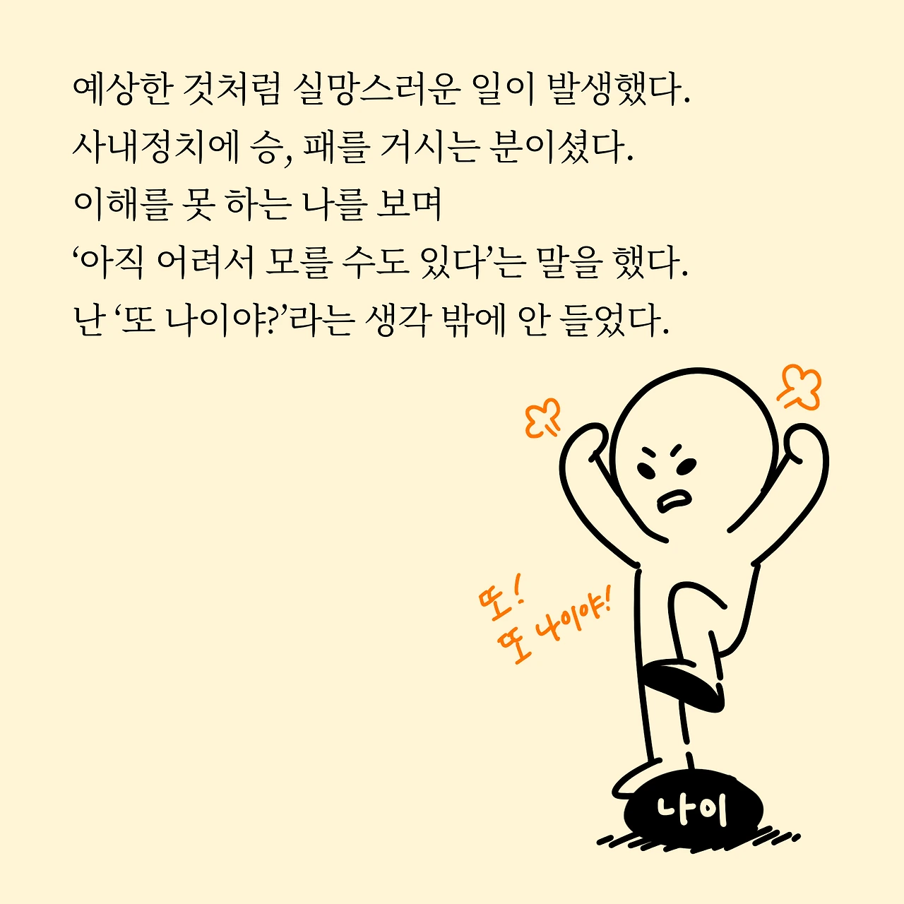 예상한 것처럼 실망스러운 일이 발생했다. 사내정치에 승, 패를 거시는 분이셨다. 이해를 못하는 나를 보며 '아직 어려서 모를 수도 있다'는 말을 했다. 난 '또 나이야?'라는 생각 밖에 안들었다.