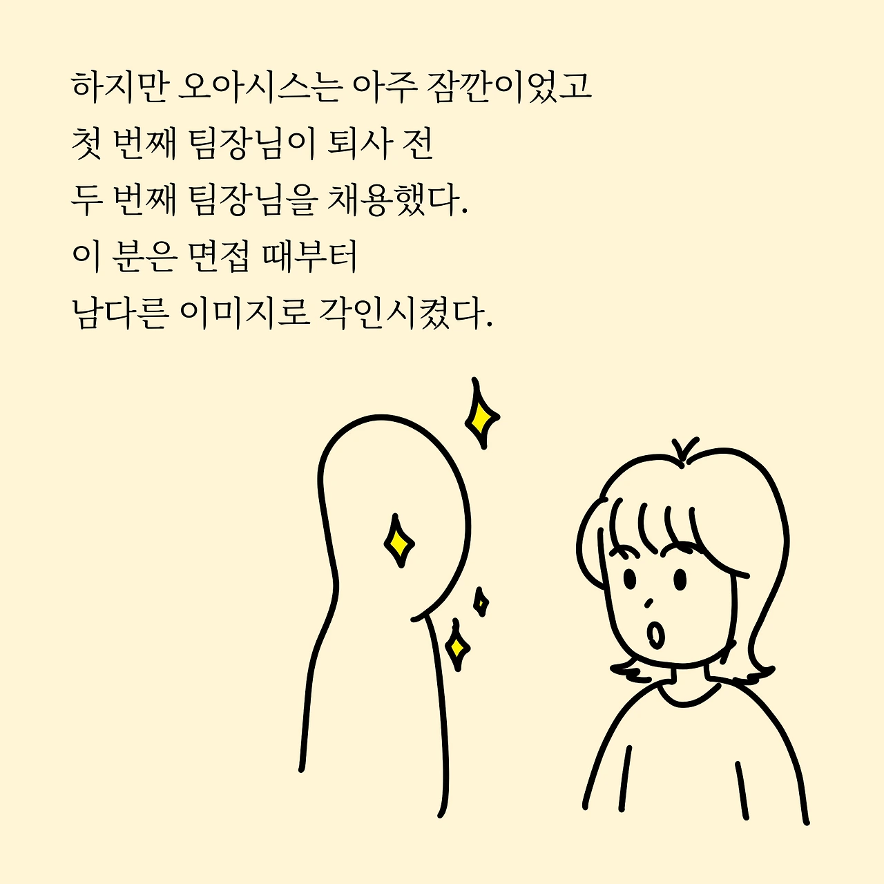 하지만 오아시스는 아주 잠깐이었고 첫 번째 팀장님이 퇴사 전 두 번째 팀장님을 채용했다. 이 분은 면접 때부터 남다른 이미지로 각인시켰다.