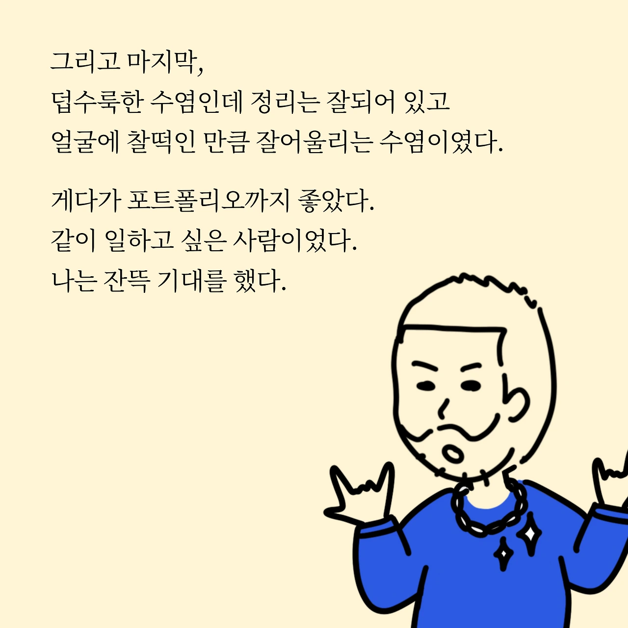 그리고 마지막, 덥수룩한 수염인데 정리는 잘되어 있고 얼굴에 찰떡인 만큼 잘어울리는 수염이였다. 게다가 포트폴리오까지 좋았으니 같이 일하고 싶은 사람이었다.