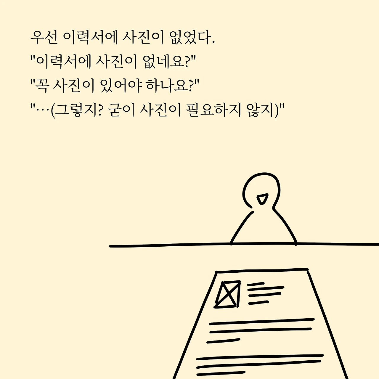 우선 이력서에 사진이 없었다. "이력서에 사진이 없네요?" "꼭 사진이 있어야 하나요?" "...(그렇지? 굳이 사진이 필요하지 않지.)"