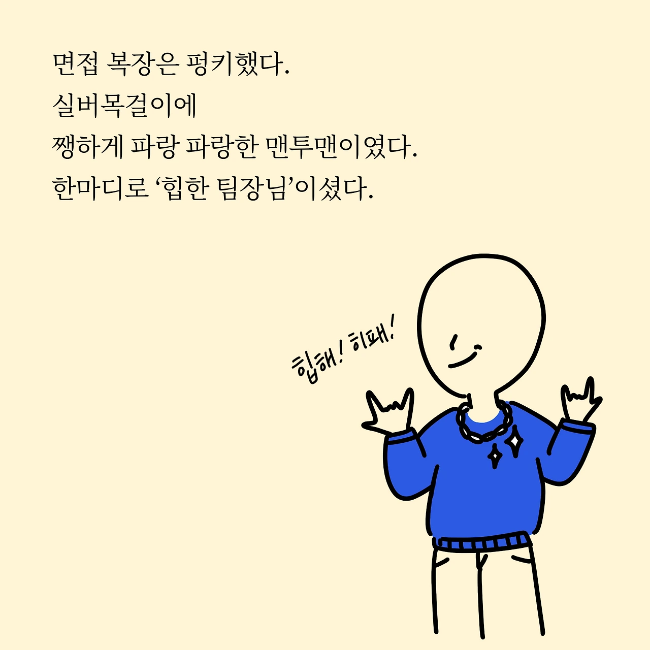 면접 복장은 펑키했다. 실버목걸이에 쨍하게 파랑 파랑한 맨투맨이였다. 한마디로 '힙한 팀장님'이셨다.