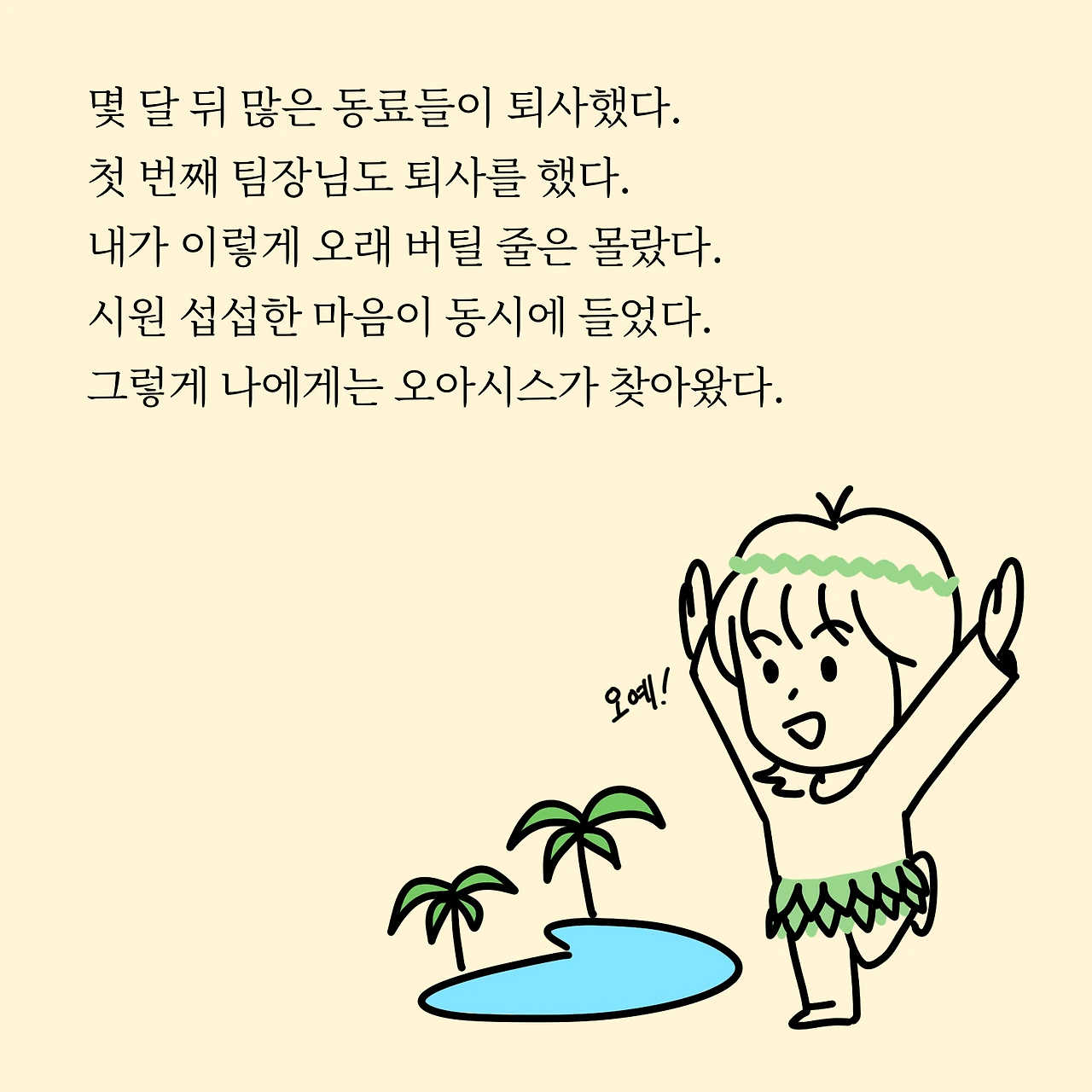 몇 달 뒤 많은 동료들이 퇴사했다. 첫 번째 팀장님도 퇴사를 했다. 내가 이렇게 오래 버틸 줄은 몰랐다. 시원 섭섭한 마음이 동시에 들었다. 그렇게 나에게는 오아시스가 찾아왔다.