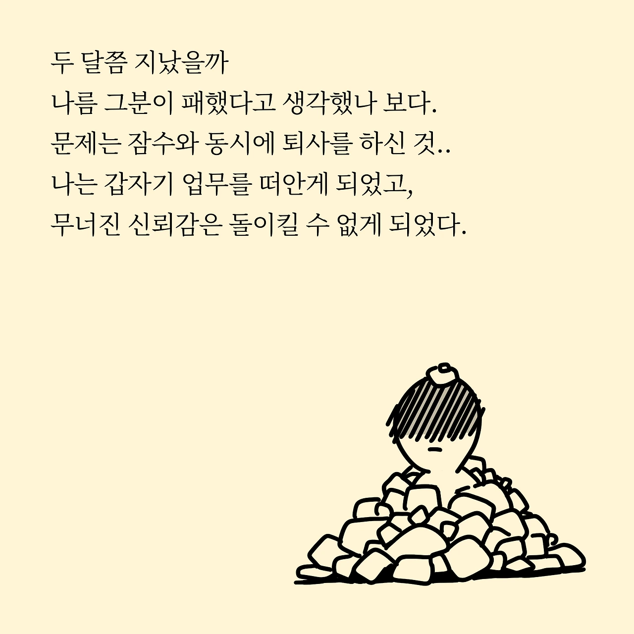 두 달쯤 지났을까 나름 그분이 패했다고 생각했나 보다. 문제는 잠수와 동시에 퇴사를 하신 것. 나는 갑자기 업무를 떠안게 되었고 무너진 신뢰감은 돌이킬 수 없게 되었다.