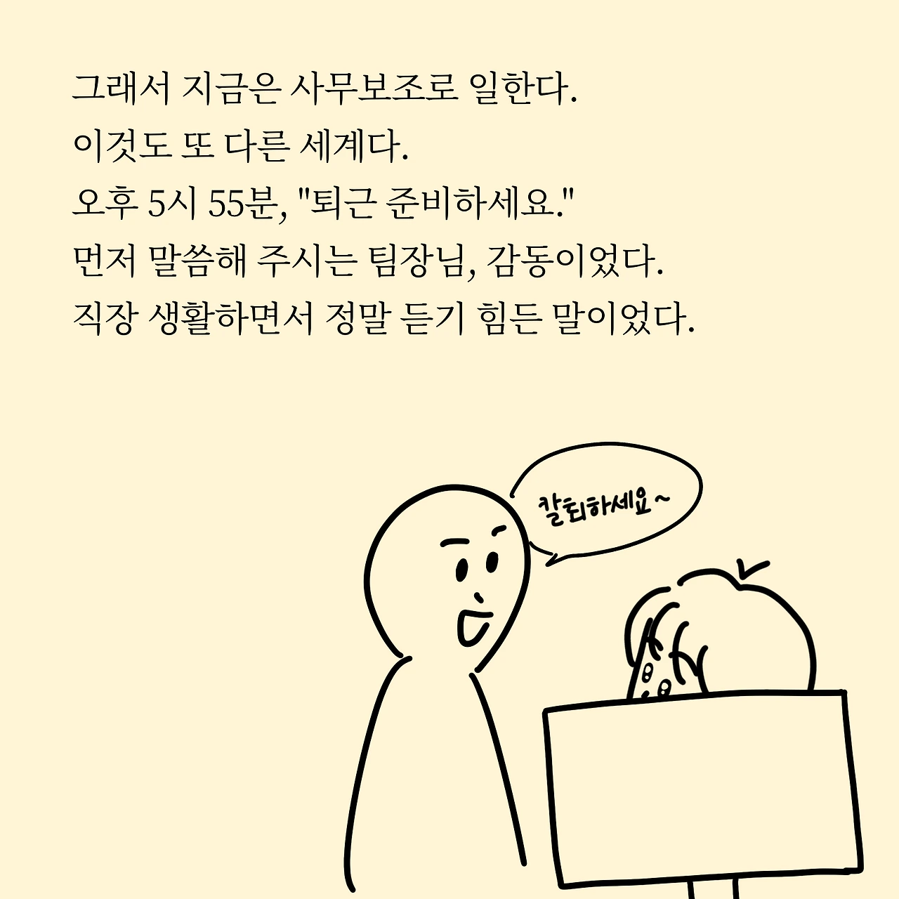 아르바이트는 시급제니까 "퇴근하세요."라는 말이 쉽게 나오는 거 같긴 합니다. 그래도 매일 정시 퇴근하니 너무 좋네요. 제 마음도, 시간도 여유롭습니다. 정시 퇴근하면 제가 하고 싶은걸 하기에, 휴식을 취하기에 충분한 시간이 주어지거든요.