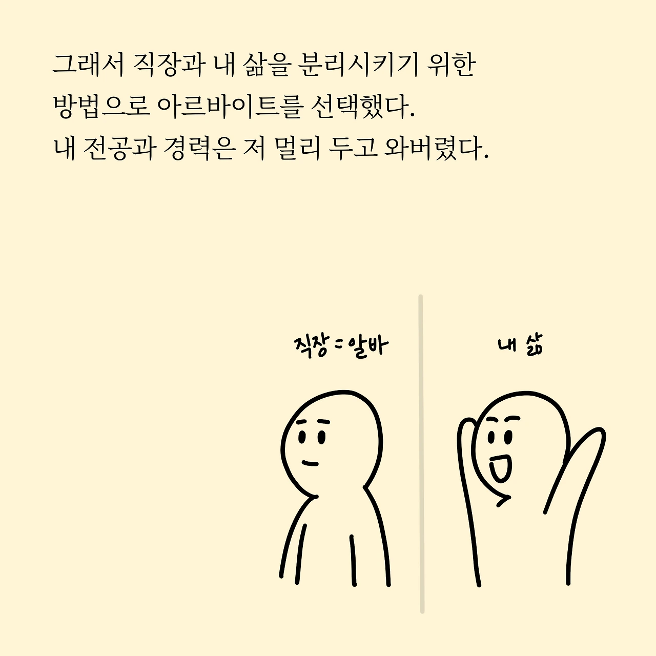 지금은 사무보조로 일하고 있습니다. 디자인 경력을 저 멀리 두고 말이죠. 주변에서 '경력 아깝지도 않냐'는 말을 많이 듣습니다. 아깝지 않다는 말은 거짓말이고 '훨씬 행복하다'라는 건 확실하게 대답할 수 있어요. 그리고 아르바이트와 직장은 별 차이 없다 생각합니다. 아르바이트를 평생 할 수 없는 것처럼 직장도 평생직장 없으니까요. 직장생활 오래 하다가 은퇴하면 어차피 또 뭔가를 해야 합니다. 그때까지 사람에 치여가며 스트레스는 받을 테지요. 저는 그럴 자신도 없고, 맞추기도 힘든 사람입니다. 그보다 일찍 은퇴는 하지만 그만큼 일찍 무언가를 찾으렵니다.