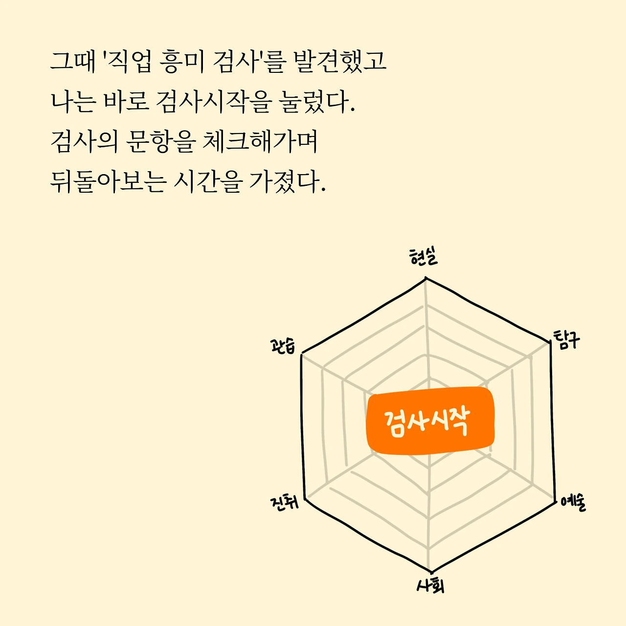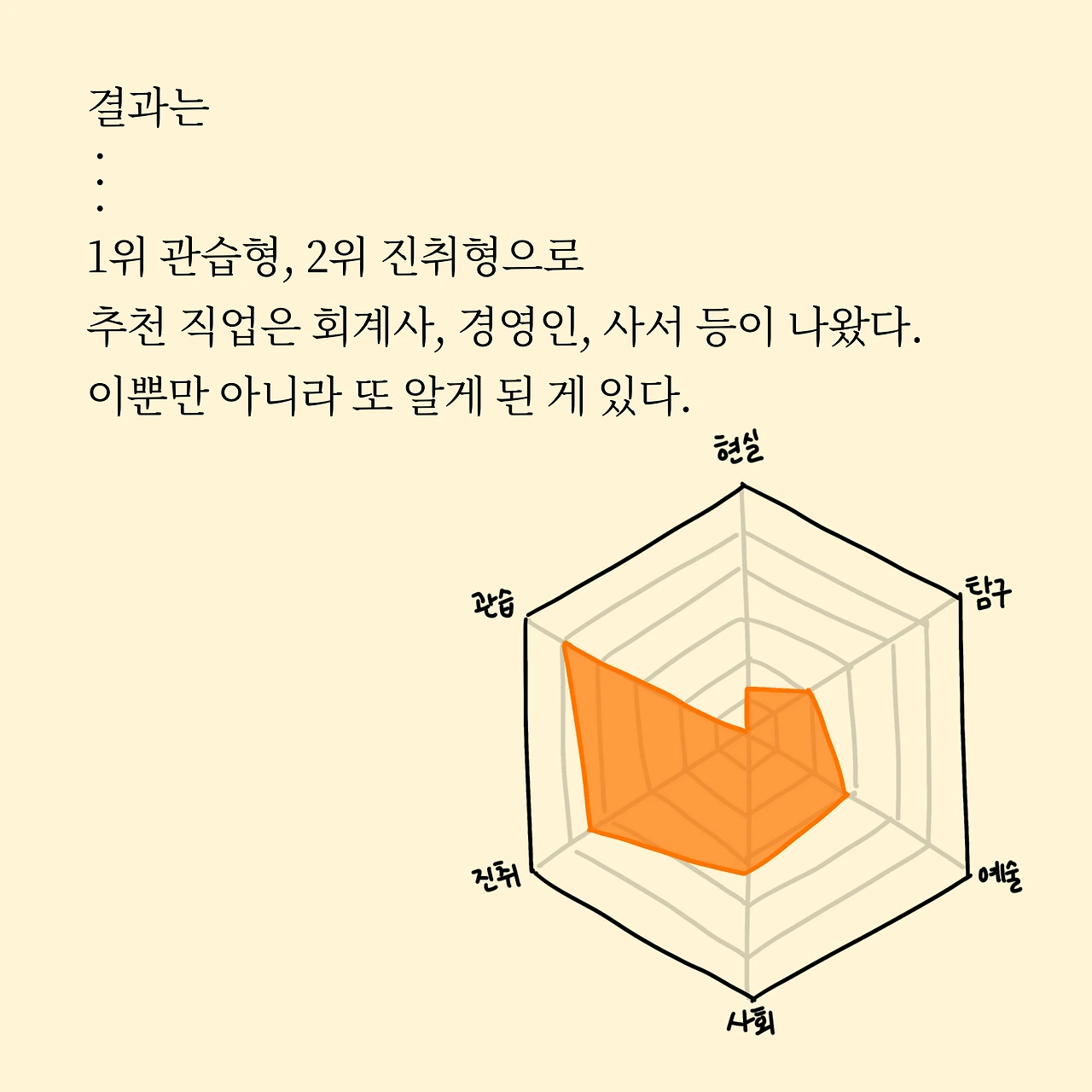 저는 그 힘이 어디서 두드러지게 나타나고, 제가 도대체 어떤 사람인지 궁금해졌습니다. 그래서 여러 관심 끝에 워크넷(고용노동부)에서 지원하는 '직업심리검사'를 발견했습니다. 보자마자 검사를 시작했습니다. 검사는 30분 정도 소요됐고 천천히 문항을 체크하며 뒤돌아보는 시간을 가졌습니다. 결과는 1위 관습형, 2위 진취형으로 추천 직업은 회계사, 경영인, 사서 등이 나왔습니다. 이뿐만 아니라 또 알게 된 것이 있습니다.