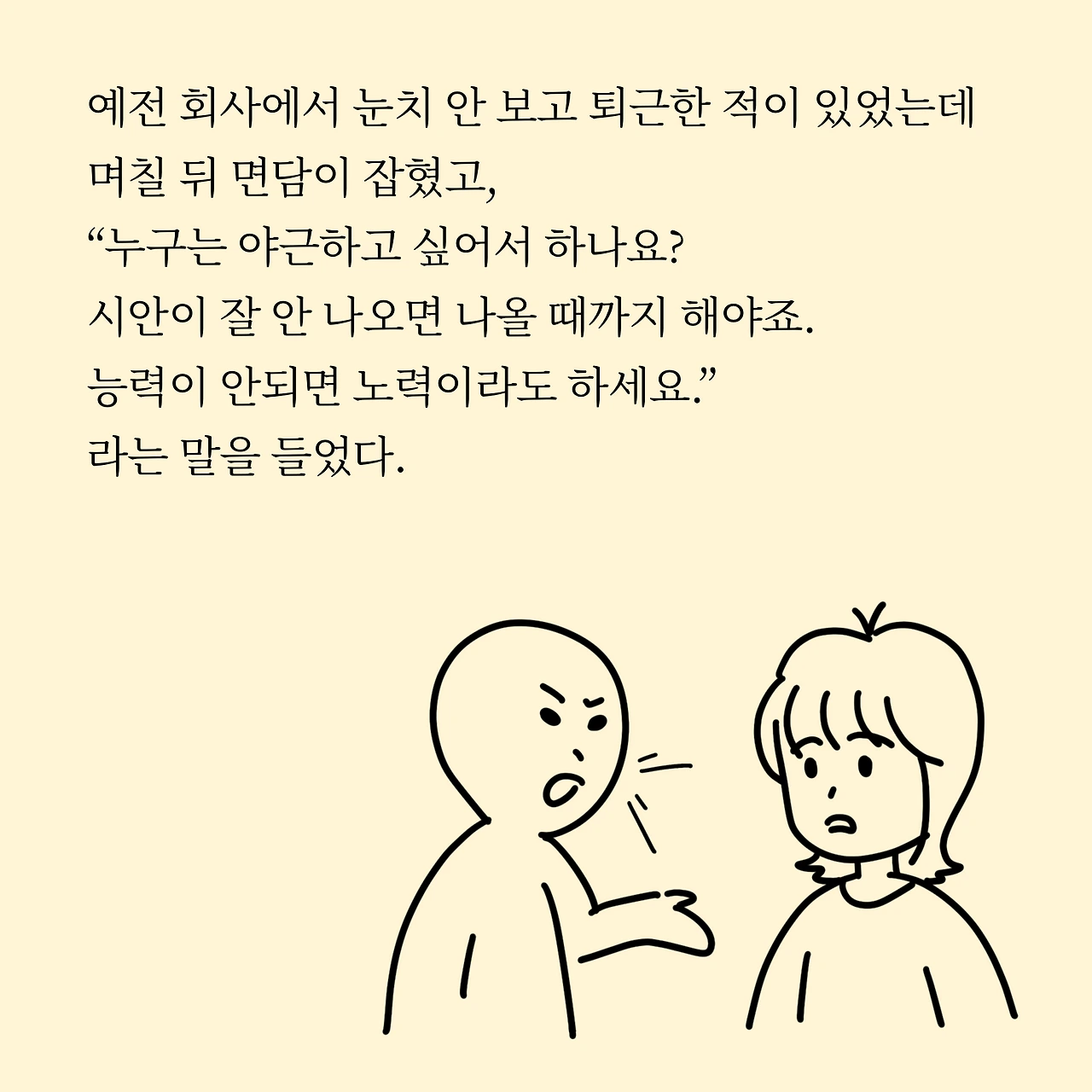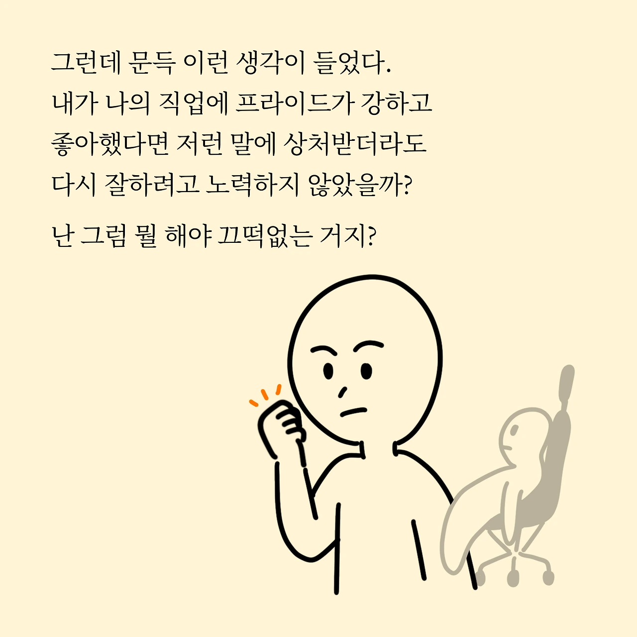 예전에 눈치 안 보고 퇴근한 적이 있었는데 며칠 뒤 면담이 잡혔고, “누구는 야근하고 싶어서 하나요? 시안이 잘 안 나오면 나올 때까지 해야죠. 능력이 안되면 노력이라도 하세요.”라는 말을 들었습니다. 저런 피드백은 누군가에게는 좋은 자극이 될 수도 있지만 저에게는 전혀 좋은 자극이 아니었어요. '더 열심히 해야겠다' 보다 '난 실력이 없나 봐' 쪽으로 저를 자꾸 의심하게 됐거든요. 그런데 문득 '내가 디자이너라는 직업에 프라이드가 강하고 사랑했다면 주춤할지라도 더 잘하려고 노력하지 않았을까?'라는 생각을 했습니다. 즉 어떠한 말에 상처 받을지라도 나 자신에게 강한 뚝심이 있으면 다시 일어날 힘이 있는 거죠.
