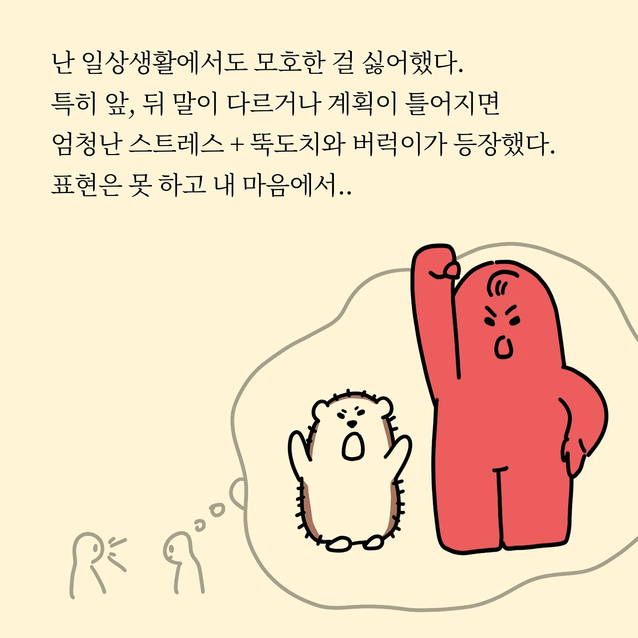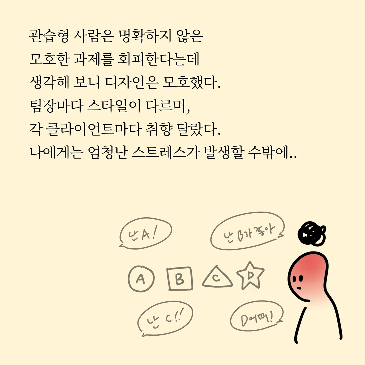위의 풀이와 함께 ‘명확하지 않은 모호한 과제를 회피한다.’라는 말이 있었는데요. 디자인이라는 게 참 모호합니다. 팀장마다 스타일이 다르며, 클라이언트에 따라 취향도 다릅니다. 저 같은 사람에게는 엄청난 스트레스가 발생할 수밖에 없었던 거 같습니다.