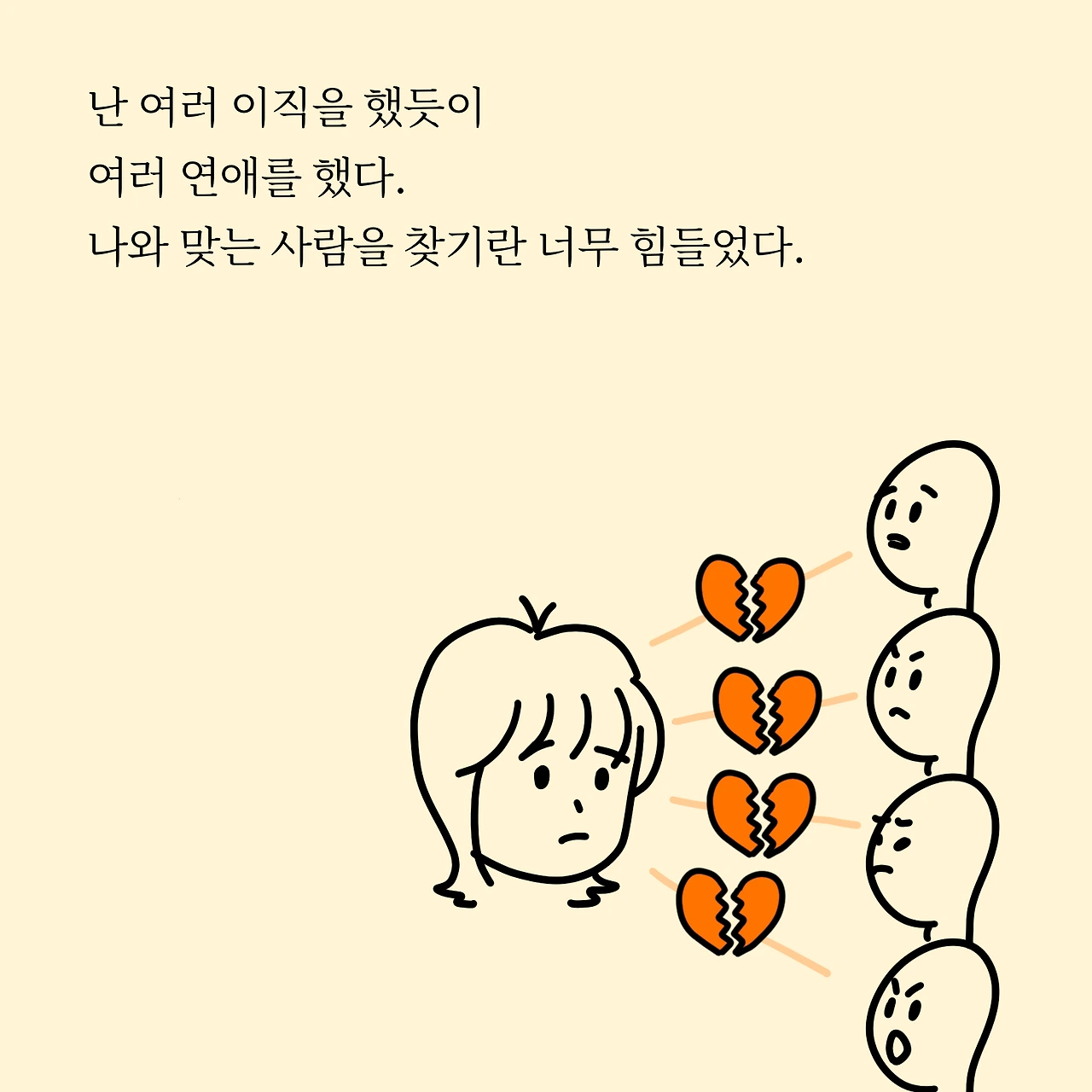 직장생활과 연애는 아주 많이 비슷하다고 생각합니다. 남자친구와 여자친구가 안 맞는 상황에 부딪히다가 헤어지는 거처럼 직장생활도 참다 참다 퇴사로 회사와 헤어지니까요. 많은 이직을 했지만 연애도 이렇게 많이 해볼 줄은 몰랐습니다. 남자친구가 이 글을 읽으면 기분이 좀 언짢을 수도 있겠어요. 그래도 여기서 만큼은 솔직한 제 얘기를 하겠습니다.