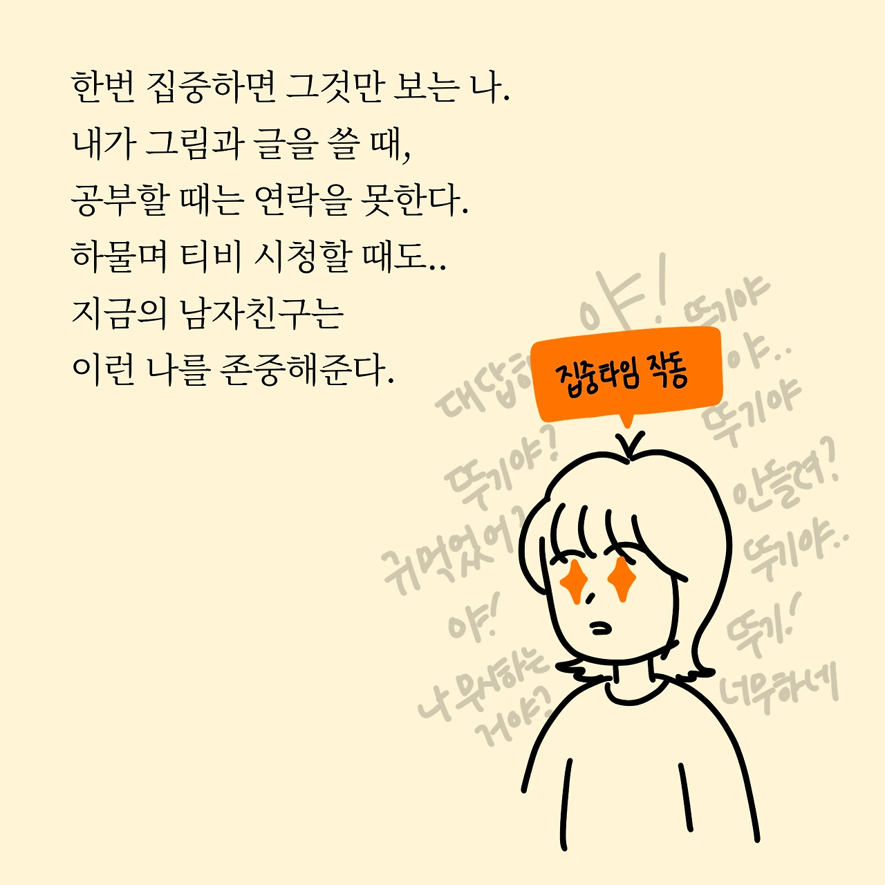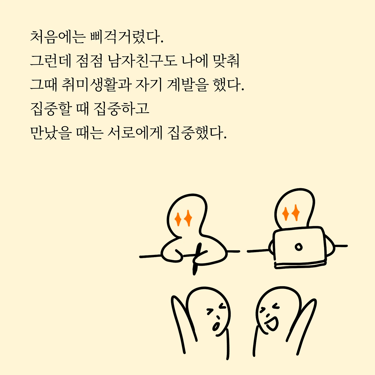 그렇게 여러 연애와 이별 끝에 지금의 남자친구를 만나게 됐습니다. 똑같이 많은 마찰이 있었지만, 이 사람은 다른 사람이랑 좀, 아니 많이 다르더라고요. 제가 문제 있는 사람처럼 느껴지기보다 흔하게 말하는 '서로 알아가는 단계'라는 걸 경험했습니다. 어떤 걸 좋아하고, 싫어하고, 잘하고, 부족한지를 파악했어요. 그래서 좋아하는 건 더 주고, 싫어하는 건 되도록 하지 않고, 잘하는 건 더 칭찬해주고, 부족한 건 더 잘할 수 있게 인도했습니다. 이 알아가는 단계는 연애 때 만 할 수 있는 소중한 경험이라 생각해요. 결혼하면 그 단계를 지나 함께 걸어가야 하는 단계입니다. 그만큼 돌이키기 힘들죠. 그러니까 이 단계를 경험하시는 분들, 경험하시게 될 분들은 꼭 제대로 서로를 알아가셨으면 좋겠습니다. 그리고 이 글을 보시는 모든 분들이 좋은 인연으로 행복하게 살아갔으면 좋겠습니다. 우리 모두 행복합시다!
