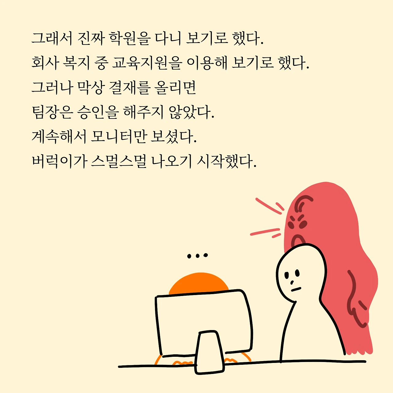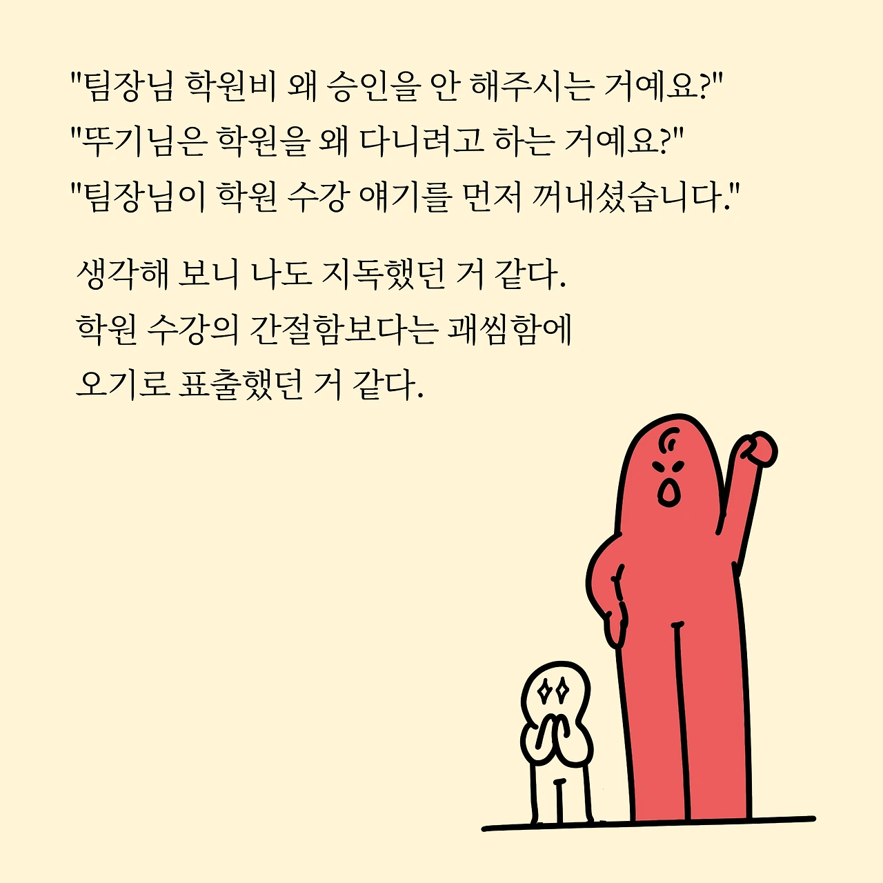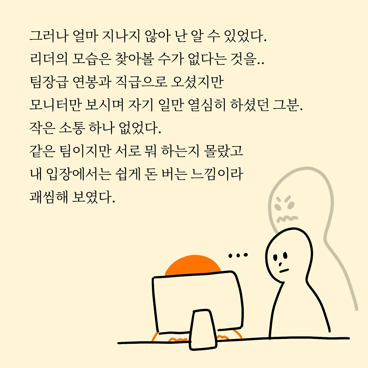 이 분은 관리자보다는 실무자에 가까운 사람이었어요. 팀을 보기보다 자기 일을 먼저 생각하시는 분이었으니까요. 그리고 서로의 스케줄이나 작업 과정, 결과물이 전혀 공유가 되지 않았습니다. 정말 하루 종일 모니터만 보시다가 퇴근을 하시더군요. 제가 생각하는 팀장(리더)은 그만큼 배울만한 게 있어야 하고, 모범이 될 만한 게 있어야 한다고 생각해요. 그래서 팀원보다 더 많은 연봉에 더 높은 직급을 주는 거 아닐까요? 일처리만 생각했으면 동료나, 후임 채용으로 건의했을 거예요. 저도 나름 당시에는 디자이너로서의 욕심이 있었고 그렇기 때문에 저보다 더 경험이 많은 분을 원했던 거였습니다. 사회생활을 하다 보니 윗사람에 대한 기준이 높아진 건가 싶기도, 애초에 제가 민감한 사람이니까 받아들여지는 게 극대화된 거일 수도 있다 싶습니다.