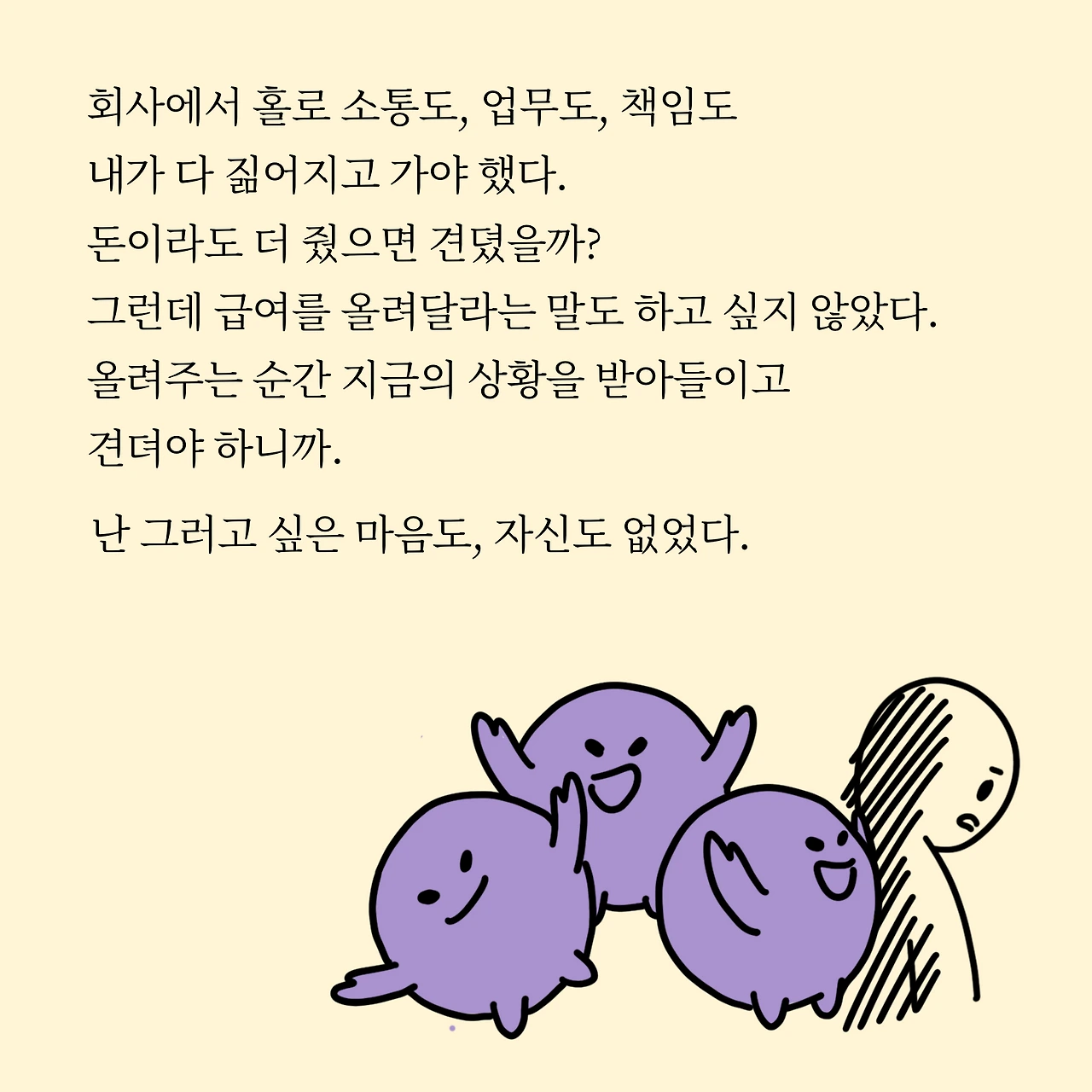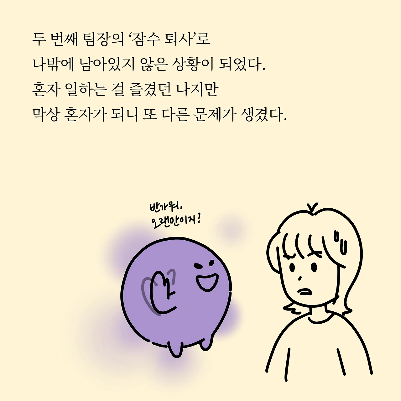 postscript. 이 경험을 통해 알 수 있었던 것은 사람은 사람과 어울려 살아갈 수밖에 없다는 거입니다. 혼자를 즐기지만 막상 혼자가 되니 힘들어했으니까요. 지금의 이 글쓰기도 혼자서 하지만 꾸준히 할 수 있는 건 제 이야기를 좋아해 주시는 분들이 있기 때문에 가능한 거라 생각합니다.(너무 감사해요.) 사람이든 일이든 부딪히는 상황은 어디서든 또 생길 거라 생각합니다. 그럴 때마다 대처하는, '나' 자신을 지키는 방법이 중요할 것 같습니다.