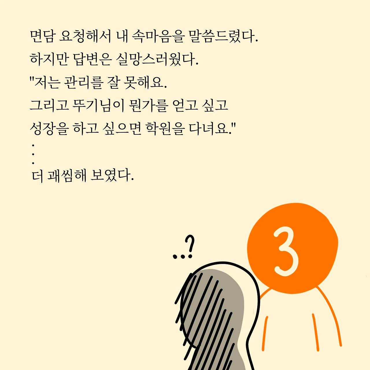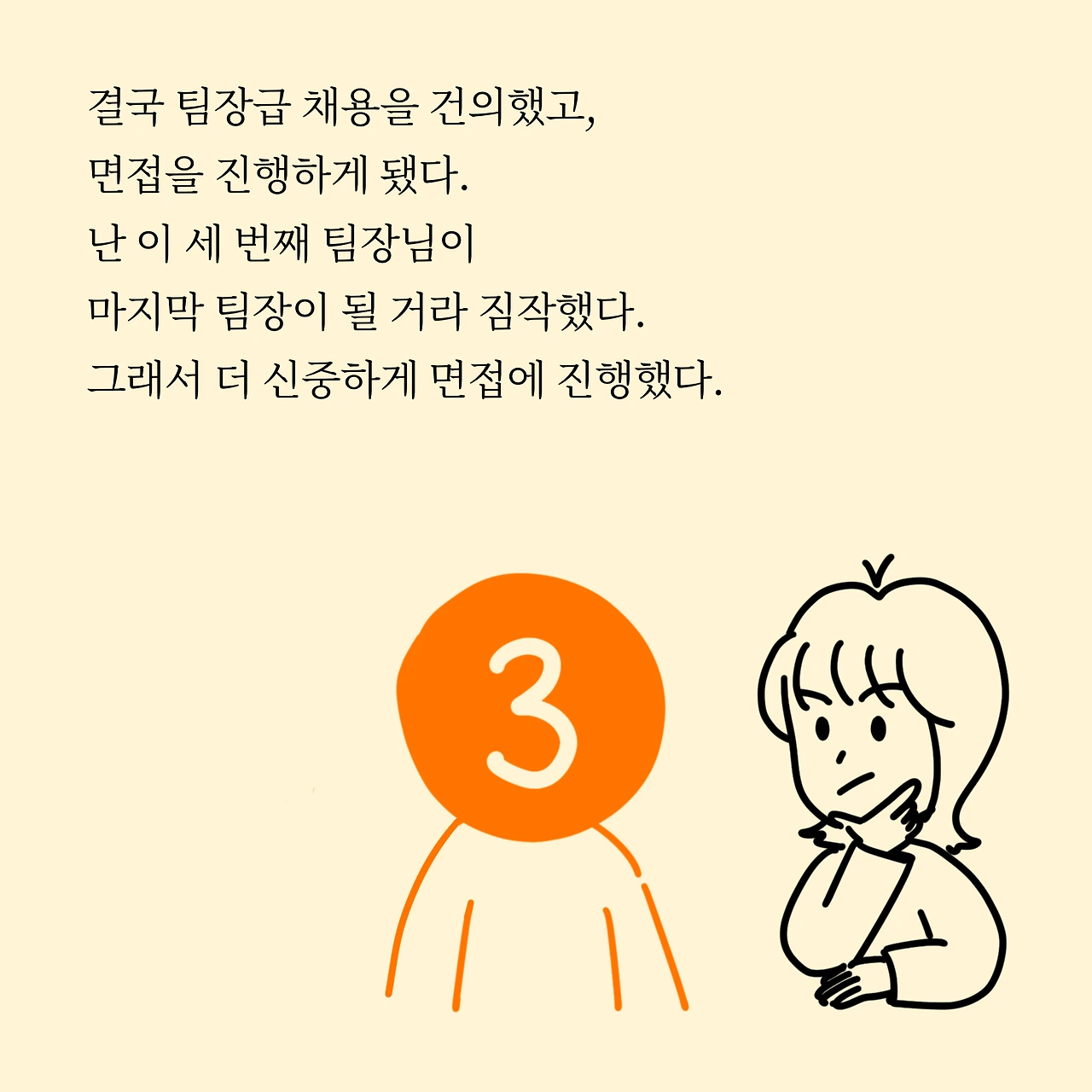 두 번째 팀장님의 잠수 퇴사로 저 혼자 남아 있는 상황이 되었습니다. 혼자 일하는 걸 즐기긴 했지만 막상 혼자가 되어보니 또 다른 문제가 있었습니다. 동료도 없고, 팀장도 없고 혼자서 소통도, 업무도, 책임도 제가 다 짊어지고 가야 했어요. 돈이라도 더 줬으면 잘 버텼을까 싶지만 더 줬다고 해도 저는 못 버텼을 거 같습니다. 지금도, 그 당시에도 견디고 싶은 마음도, 자신도 없었으니까요. 결국 팀장급 채용을 건의했고 면접을 진행하게 되었습니다. 저는 이 세 번째 팀장님이 마지막 팀장이 될 거라 예상했습니다. 그래서 더 신중하게 면접을 참관했어요. 첫 번째, 두 번째 팀장님이 개성 있던 성격이라 무난한 사람과 일하고 싶었습니다.