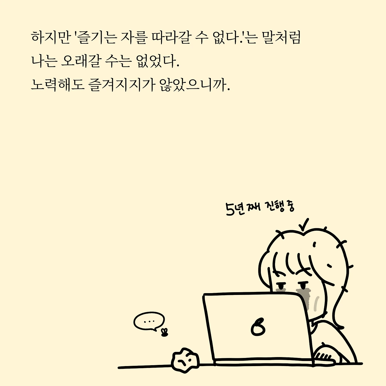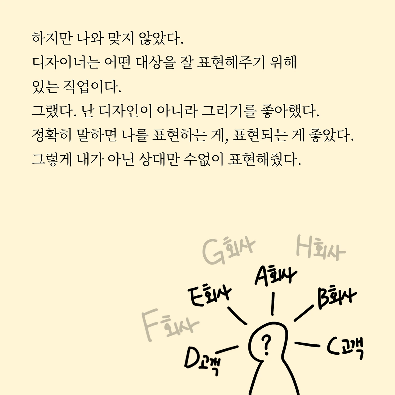 하지만 오래가지는 못하더라고요. 즐기는 자를 이길 수 없다는 말처럼 아무리 노력을 해도 즐겨지지가 않았습니다. 계속해서 제 실력을 의심하고 채찍질하기 바빴죠. 디자이너는 회사, 클라이언트가 말하는 컨셉을 캐치해서 구현해줘야 합니다. 사실 저는 그 반대인 제 자신을 표현하고, 표현되는 게 좋았습니다. 그래서 글과 그림이 좋았고요. 그렇게 제가 아닌 상대만 수없이 표현해줬습니다.