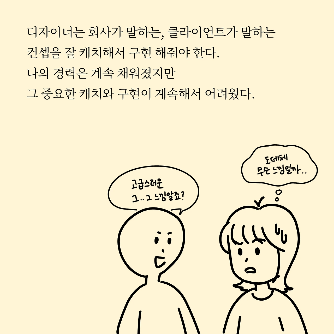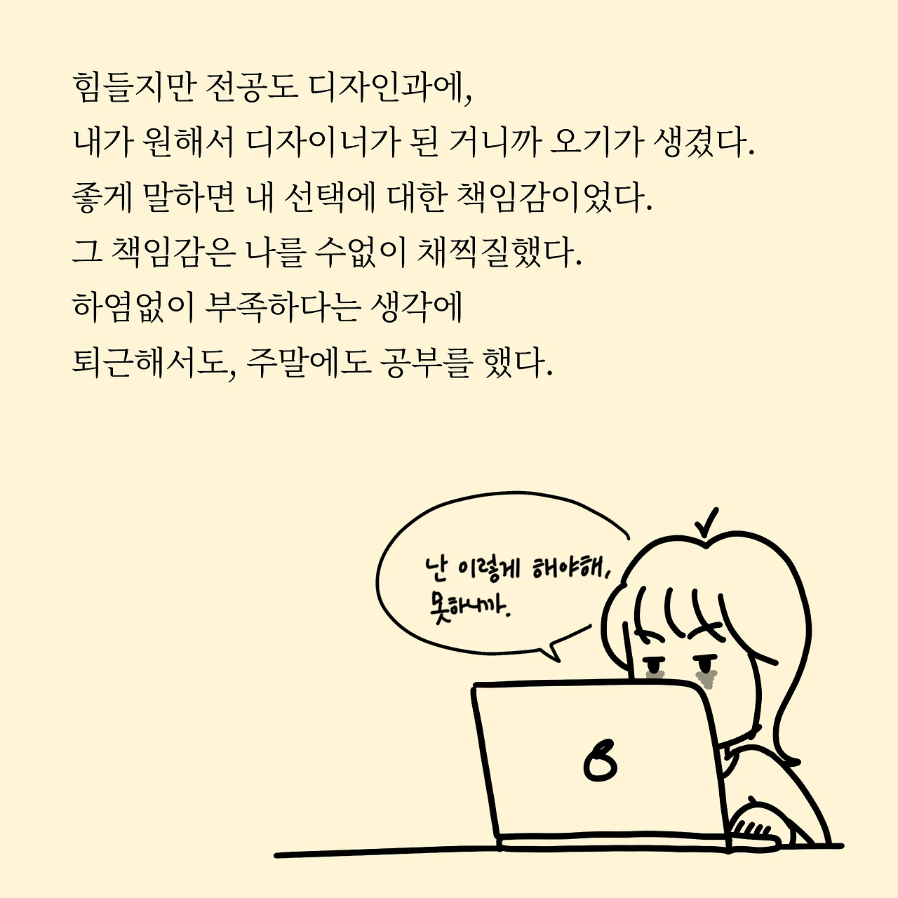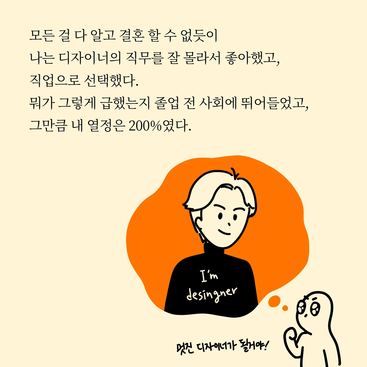 모든 걸 다 알고 결혼하는 게 힘든 만큼 저는 디자이너의 직무를 잘 몰라서 좋아했고, 직업으로 선택했습니다. 뭐가 그렇게 급했는지 졸업 전 취업을 했고, 그만큼 제 열정은 불타올라있는 상태였어요. 하지만 첫 직장에서부터 디자인이 저와 맞지 않다는 것을 알았어요. 그렇지만 입사 전의 그 열정과 너무 다른 이 괴리 또한 벗어나고 싶었습니다. 또한 디자인과 전공에, 내가 선택한 직업에 대한 책임을 지고 싶었어요. 학창 시절부터의 디자이너 말고는 다른 직군을 생각해본 적 없던 저라 더 책임감이 컸던 거 같습니다. 이 책임감 하나로 버텼습니다.