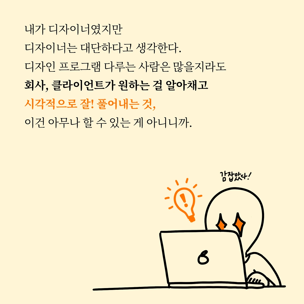 디자이너였던 저지만 디자이너는 대단한 직업이라고 생각합니다. 디자인 프로그램을 다루는 사람은 많을지라도 회사, 클라이언트가 원하는 걸 알아채고 시각적으로 잘(이게 참 모호하죠.) 풀어낸다는 건 아무나 할 수 있는 게 아니니까요.