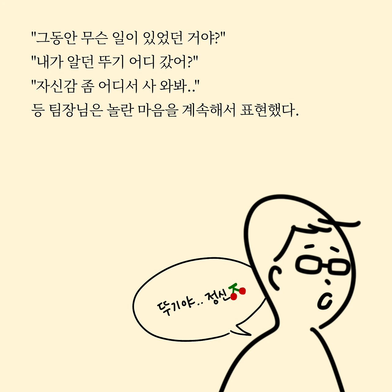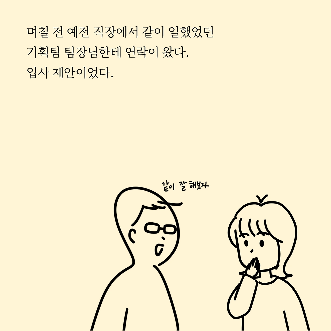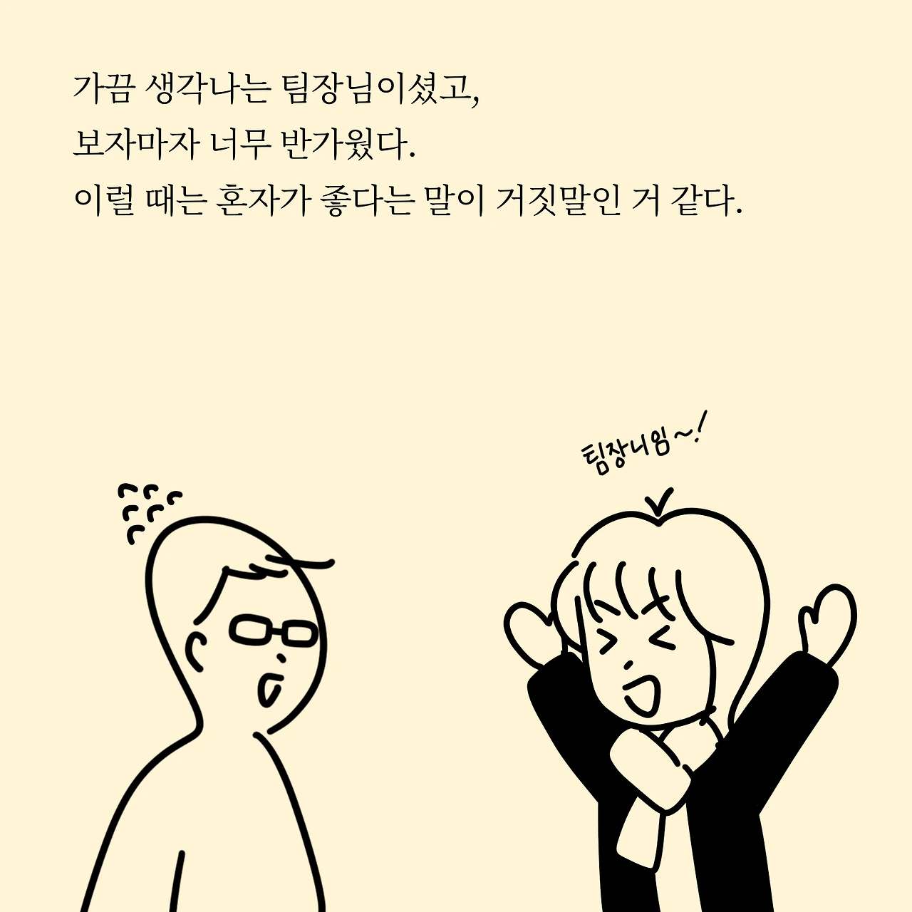 제 속마음을 들은 팀장님은 많이 놀라셨고, 동시에 아쉬워하셨어요. 그리고 '우선 일하든 안 하든 얼굴이나 한번 보자.'는 말씀에 저는 바로 찾아뵈었습니다. 제가 존경스럽게 보기도 했어서 가끔 더 생각이 났던 분 중 한 분이셨어요. 만나자마자 저는 하이톤의 목소리가 나왔습니다. "팀장니임!" 라고 소리치며 말이죠. 이럴 때는 혼자 있는 게 좋다는 말이 거짓말인 거 같네요.