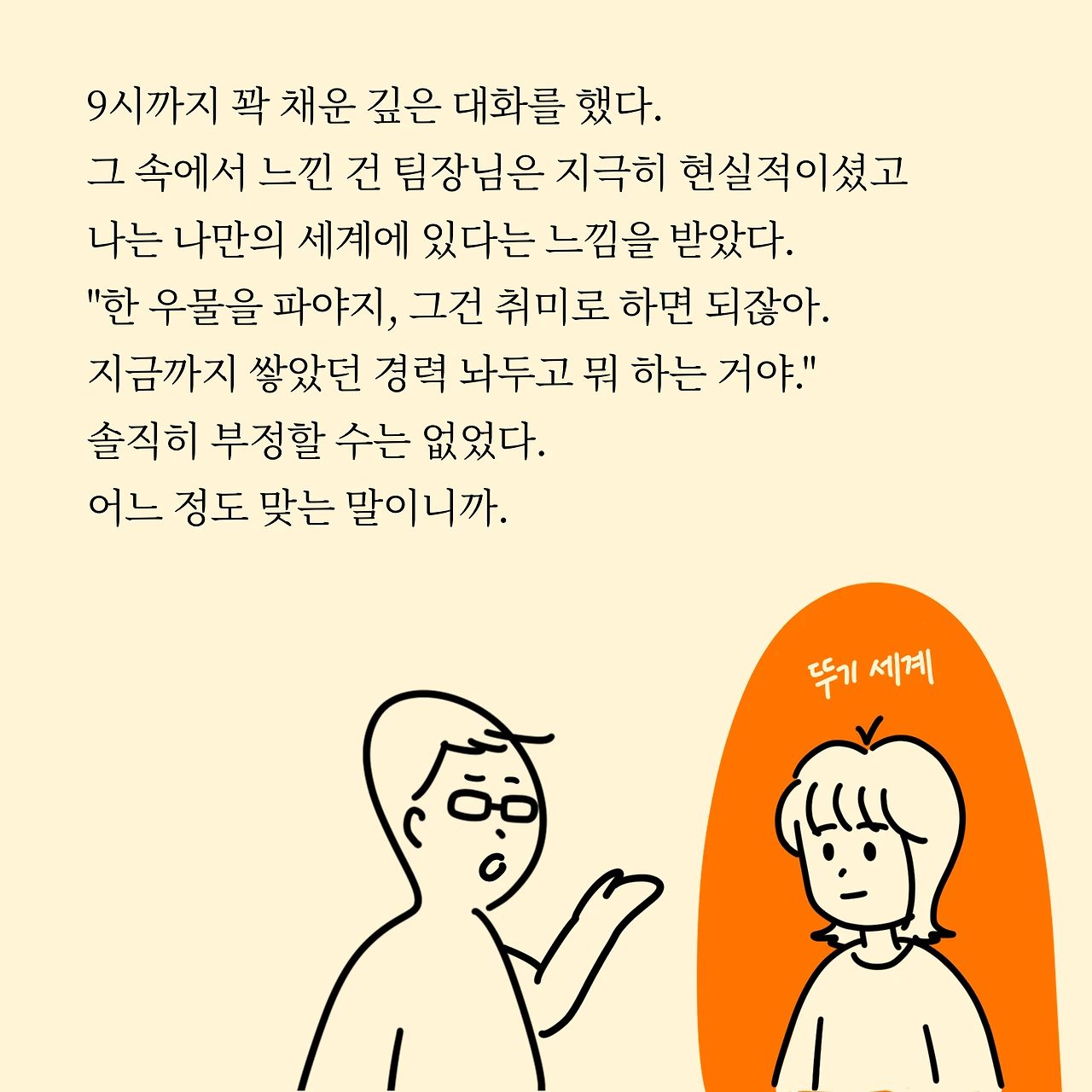 9시까지 팀장님과 저는 꽉 채운 깊은 대화를 나눴습니다. 제가 디자인을 왜 놔버렸는지, 왜 한 우물만을 못 파는지요. 많은 얘기라 오갔지만 팀장님은 지극히 현실적이었고, 저는 저만의 세계가 있다고 느꼈습니다.