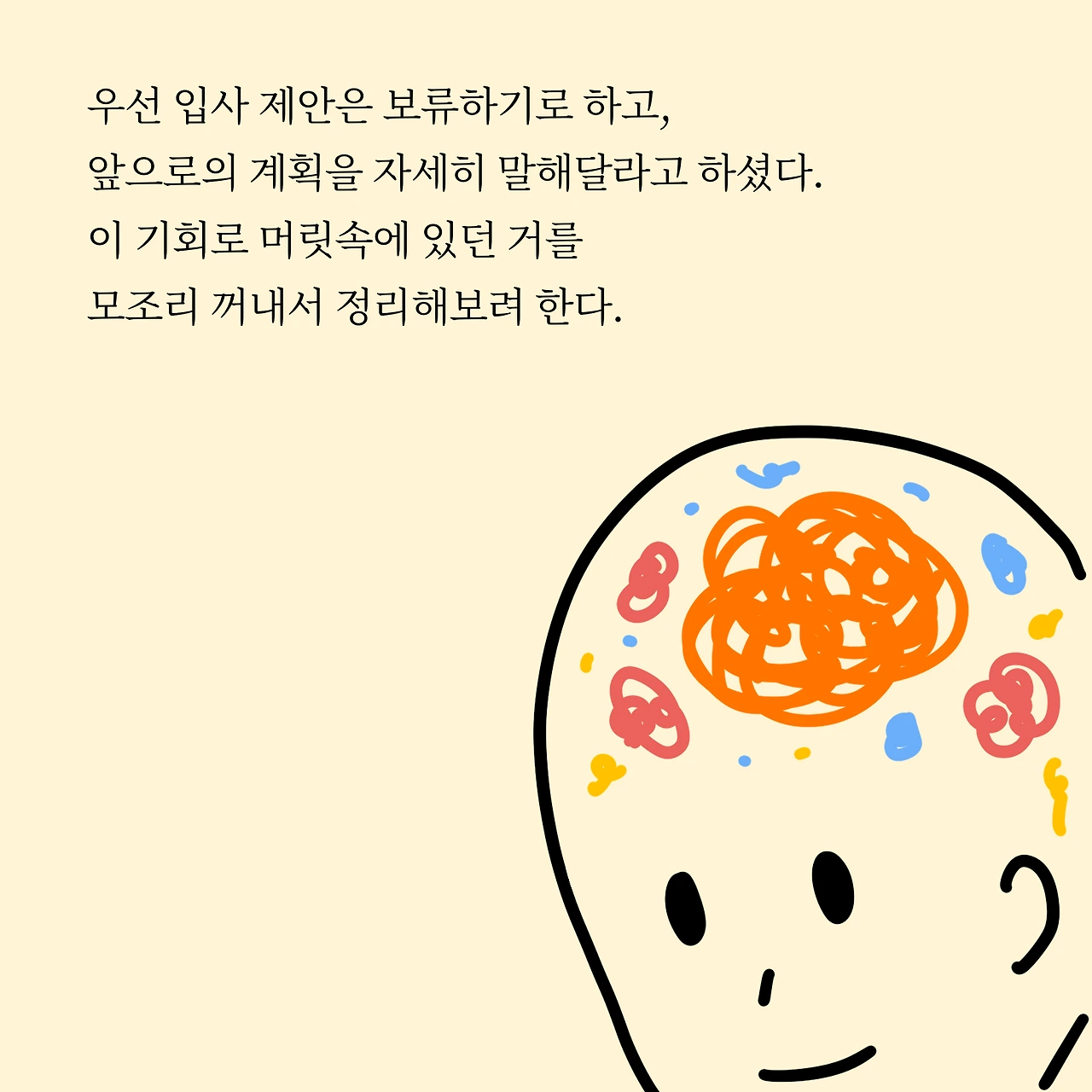 플랜 B를 찾는 중인데 쉽지는 않습니다. 당연히 쉽지 않은 게 당연하겠죠? 그래도 계속 찾으려고 노력은 할 거예요. 즐겁게 행복하게 먹고살고 싶거든요. 저는 그래야 오래 할 수 있는 사람이니까요. 우선은 입사 제안은 보류하기로 하고, 제 앞으로의 계획을 듣고 싶어 하셔서 이 기회로 머릿속에 있던 거를 모조리 꺼내서 정리해보려 합니다.