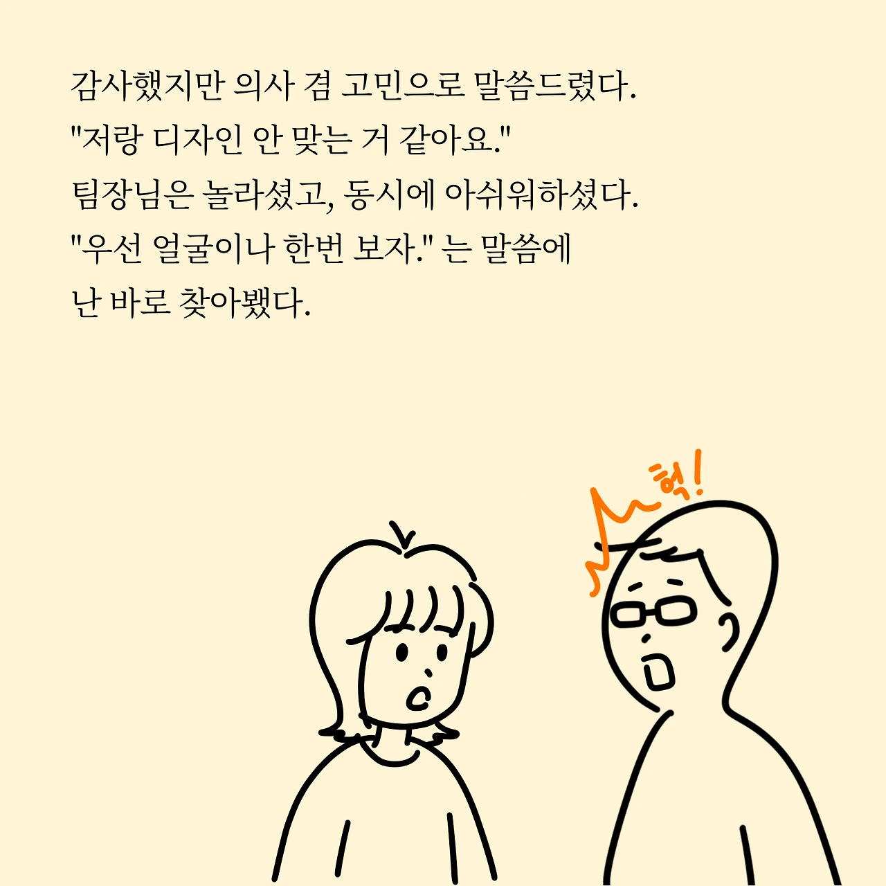 며칠 전 예전 직장에서 같이 일했었던 기획팀 팀장님한테 연락이 왔습니다. 너무 감사하게도 입사 제안 연락이었어요. 그렇지만 솔직하게 말씀드렸어요. "저랑 디자인 안 맞는 거 같아요."라고요. 지인 추천 입사는 더 신중해야 된다고도 생각했고요. 제가 팀장님 얼굴에 먹칠하면 안 되잖아요.^^ 게다가 디자인 안 맞다고, 못하겠다고까지 굳어진 마음인지라 쉽사리 입사를 하고싶다는 말이 안 나왔습니다.