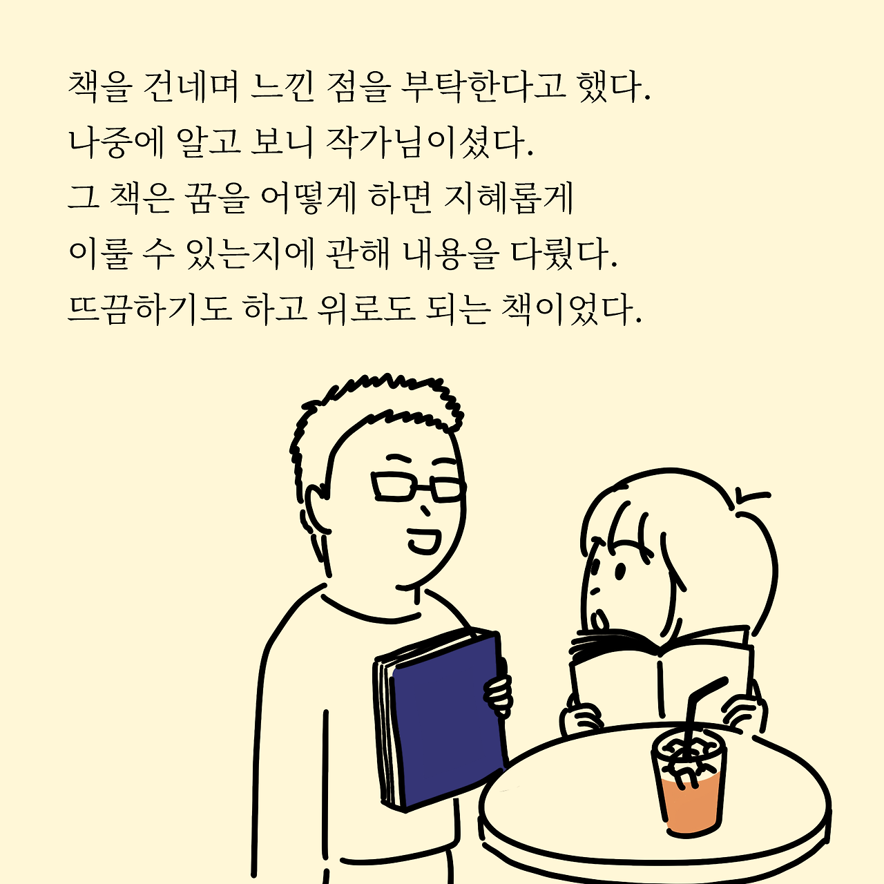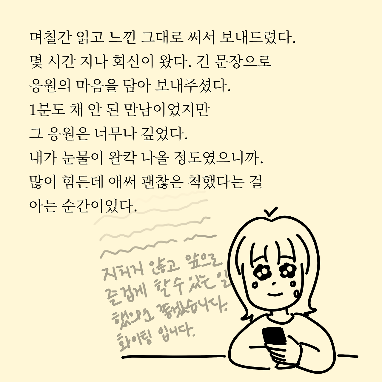 저는 직장을 퇴사하면서 번아웃과 동시에 우울증세가 있었습니다. 퇴사를 몇 번 해봤지만 이렇게 우울 해진 적은 없었다 보니 대처하기 어려운 상태였습니다. 이직 준비는 당연히 못하고 있었고, 그렇다고 새롭게 도전할 용기는 부족했고, 마냥 쉬어보니 쉬는 게 아니라 저한테는 무기력이었습니다. '가만히 있으면 쉬는 건가?' '과자나 이렇게 먹으면서 유튜버 보면 되는 건가?' 별 생각을 하면서 한 달을 그냥 보냈습니다. 그러다 뭐라도 해보자라고 시작한 게 이 그림과 글이였고, 이 걸 통해 저는 생각지도 못한 공감과 위로, 응원을 받았습니다. 저에게는 치료와 같았고 그 응원들을 통해 다시 일어설 수 있었어요. 그래서 다시 취업준비도 할 수 있는 의지가 생기기도 했고요.