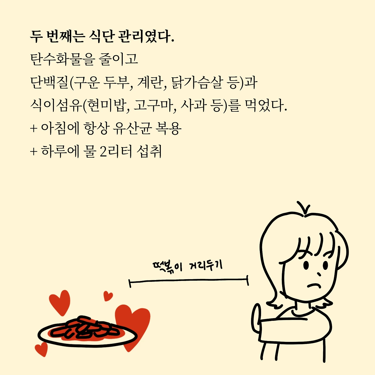 두 번째는 식단관리였다. 탄수화물을 줄이고 단백질(구운 두부, 계란, 닭가슴살 등)과 식이섬유(현미밥, 고구마, 사과 등)를 먹었다. 여기서 변비 탈출을 위해 아침에는 항상 유산균 복용을 했다.