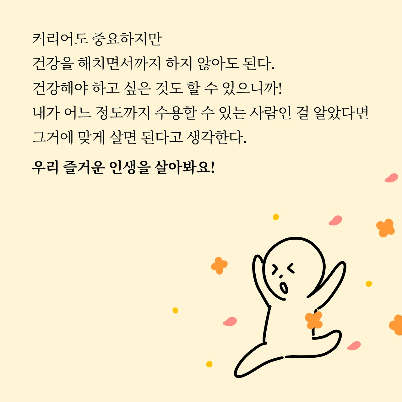 커리어도 중요하지만 건강을 해치면서까지 하지 않아도 된다 생각해요. 건강해야 하고 싶은 것도 할 수 있으니까요! 내가 어느 정도까지 수용할 수 있는 사람인 걸 알았다면 그거에 맞게 살며 거기서 성장하는 게 빠른 길일지도 모릅니다. 한번 사는 인생 하고 싶은 거 하며 즐겁게, 행복하게 살아봅시다! 모두 파이팅!
