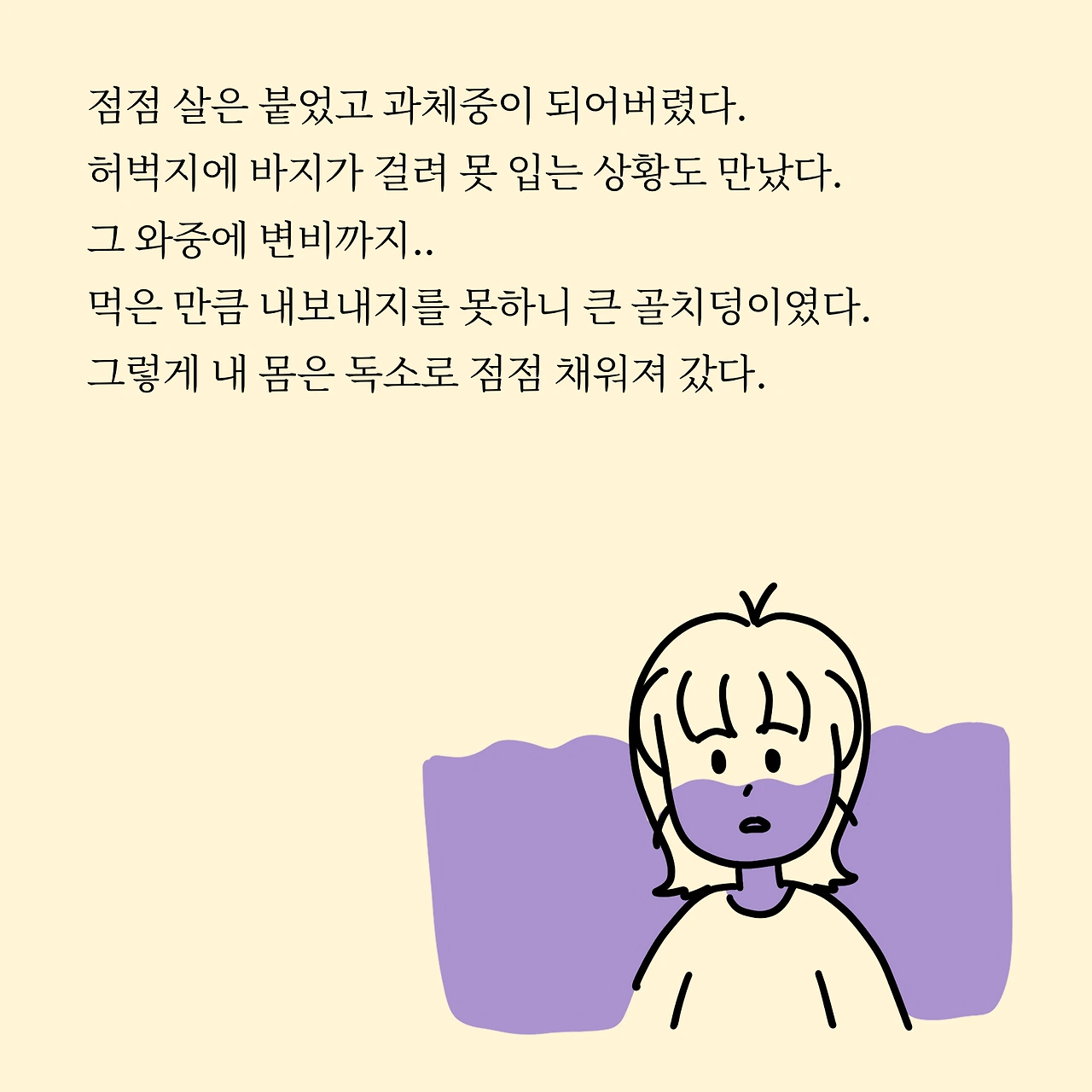점점 살은 붙었고 과체중이 되어버렸다. 허벅지에 바지가 걸려 못 입는 상황도 만났다. 그 와중에 변비까지.. 먹은 만큼 내보내지를 못하니 큰 골칫덩이였다. 그렇게 내 몸은 독소로 점점 채워져 갔다. 다이어트가 시급했다.