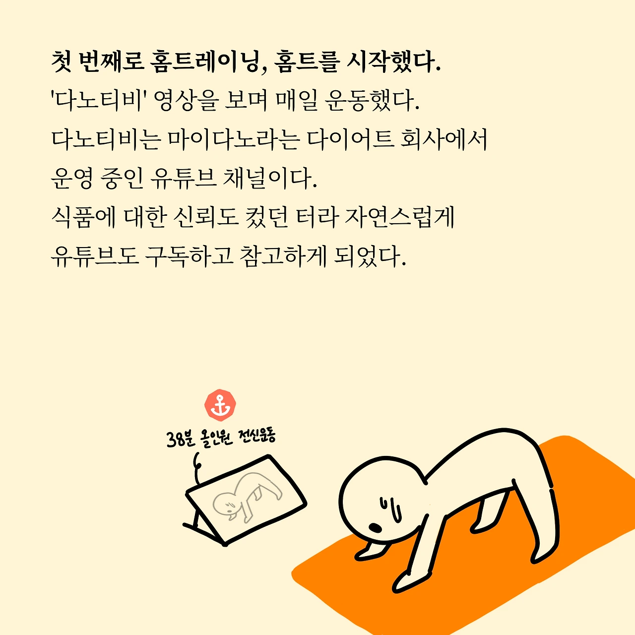 첫 번째로 홈트레이닝, 홈트를 시작했다. '다노티비'영상을 보며 매일 운동했다. 다노티비는 마이다노라는 다이어트 회사에서 운영 중인 유튜브 채널이다. 식품에 대한 신뢰도 컸던 터라 자연스럽게 유튜브도 구독하고 참고하게 되었다.