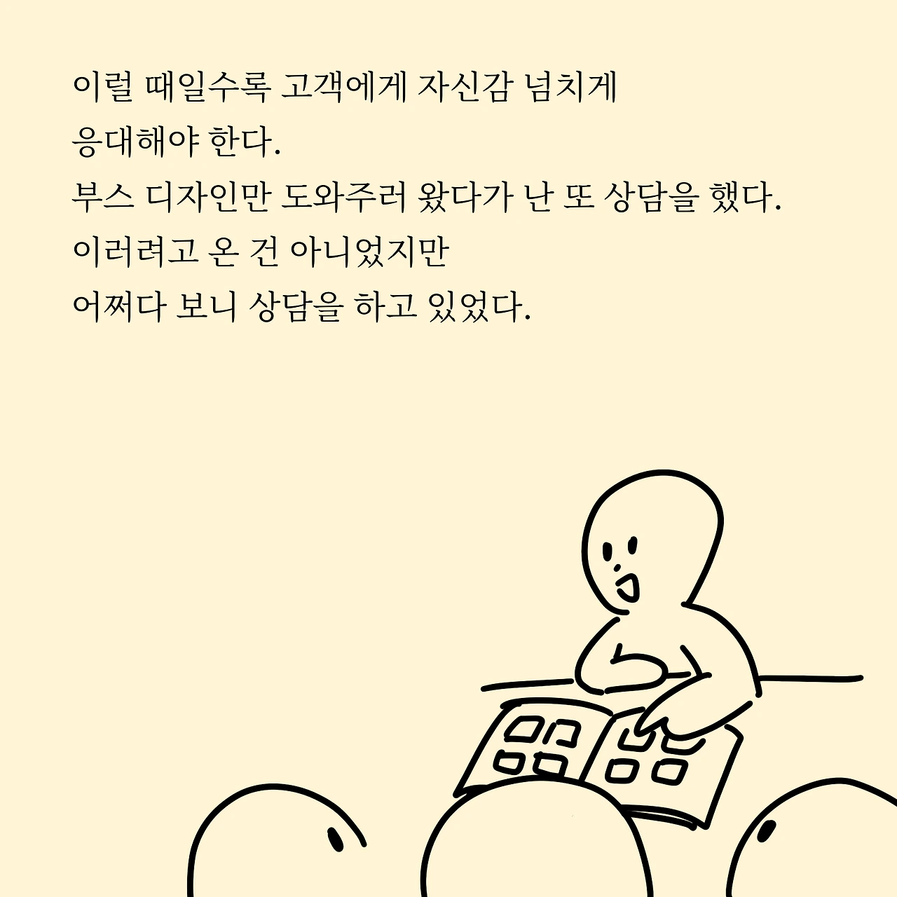 이럴 때일수록 고객에게 자신감 넘치게 응대해야 한다. 부스 디자인만 도와주러 왔다가 난 또 상담을 했다. 이러려고 온 건 아니었지만 어쩌다 보니 상담을 하고 있었다.