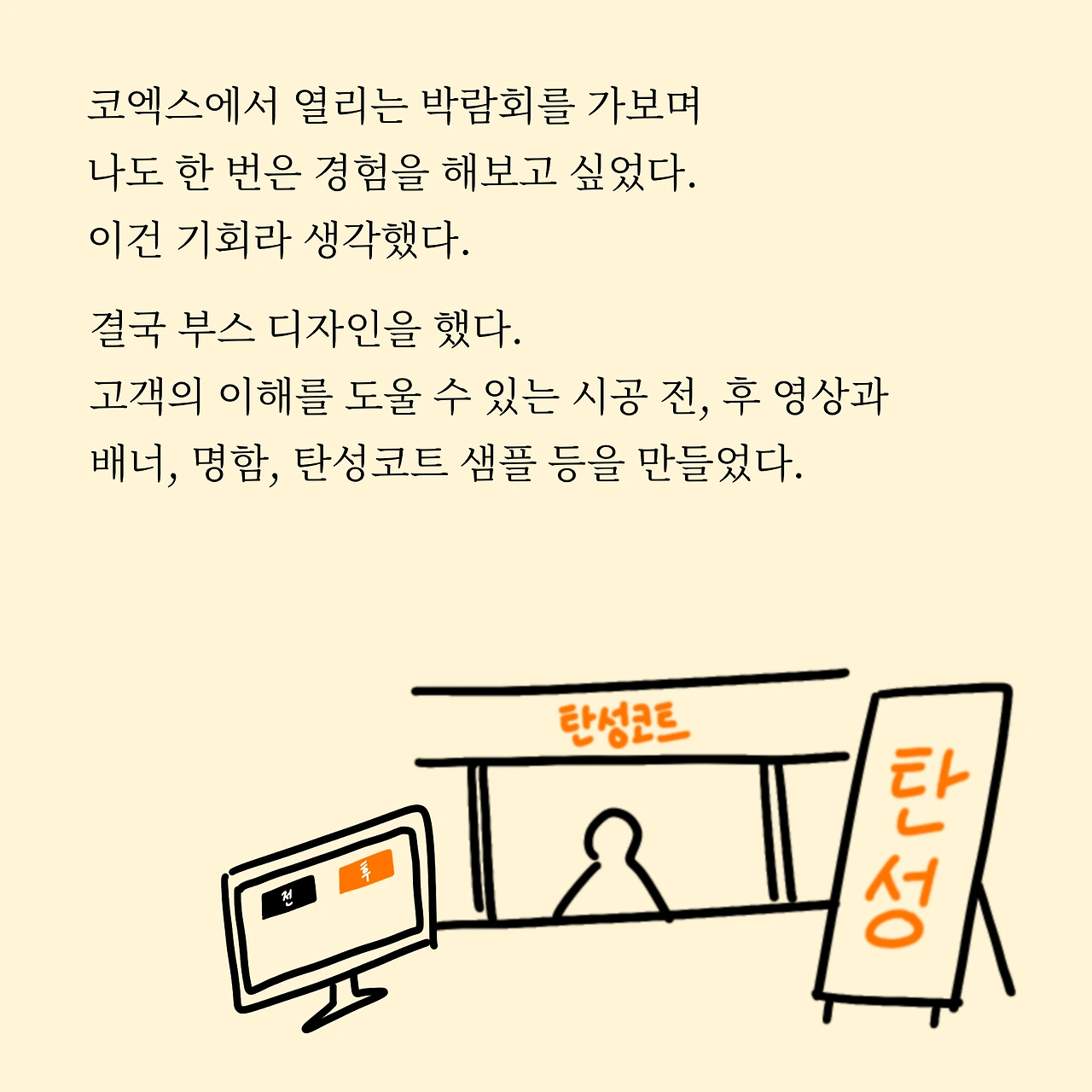 코엑스에서 열리는 박람회를 가보며 나도 한 번은 경험을 해보고 싶었다. 이건 기회라 생각했다. 결국 부스 디자인을 했다. 고객의 이해를 도울 수 있는 시공 전, 후 영상과 배너, 명함, 탄성코트 샘플 등을 만들었다.