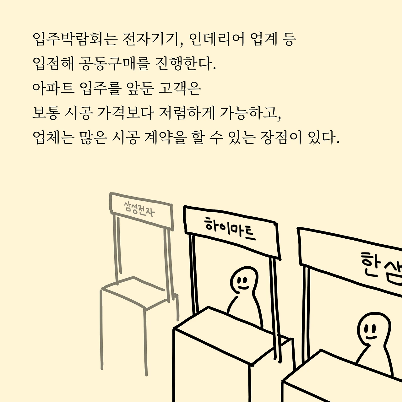 입주박람회는 전자기기, 인테리어 업계 등 입점해 공동구매를 진행한다. 아파트 입주를 앞둔 고객은 보통 시공 가격보다 저렴하게 가능하고, 업체는 많은 시공 계약을 할 수 있는 장점이 있다.