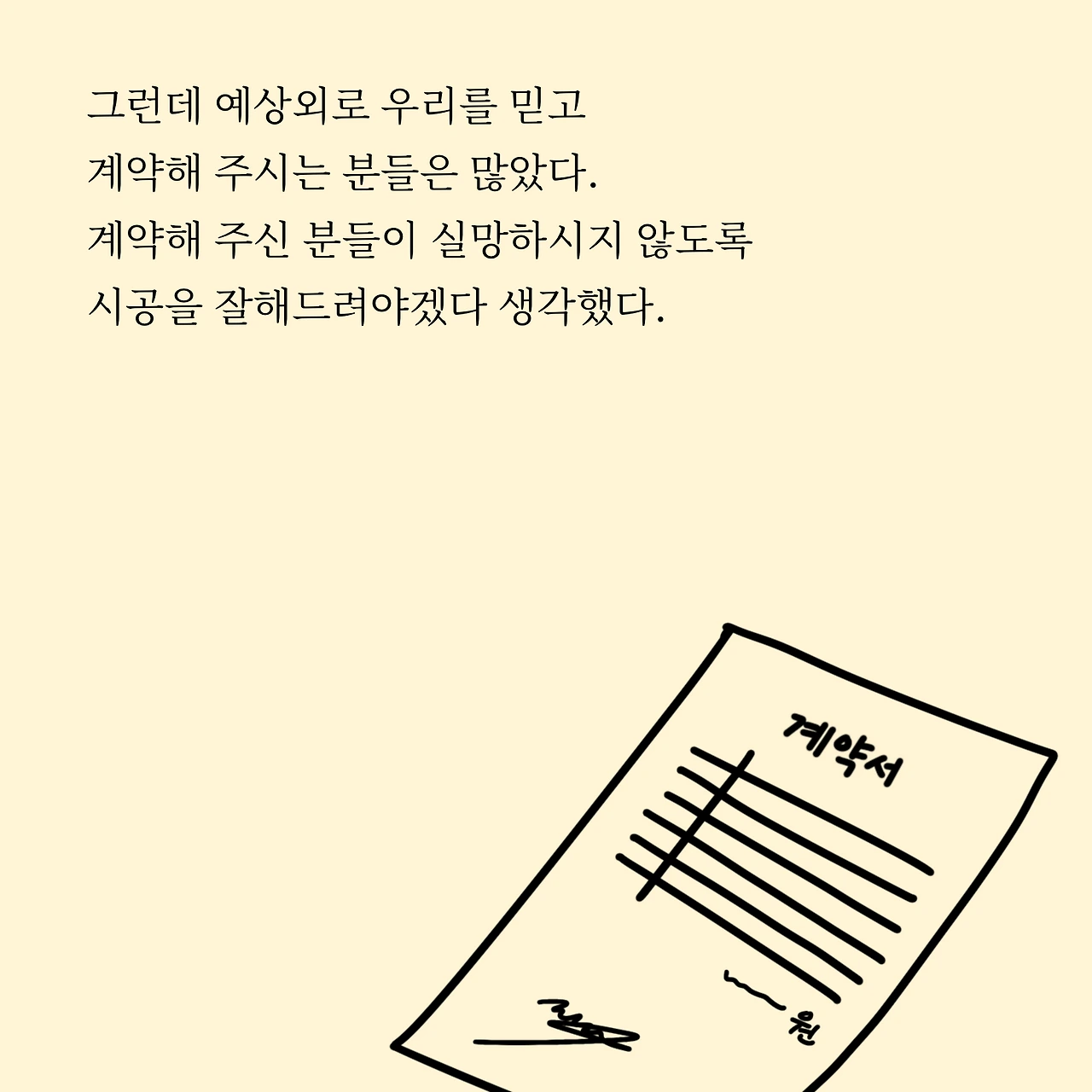 그런데 예상외로 우리를 믿고 계약해 주시는 분들은 많았다. 계약해 주신 분들이 실망하시지 않도록 시공을 잘해드려야겠다 생각했다.