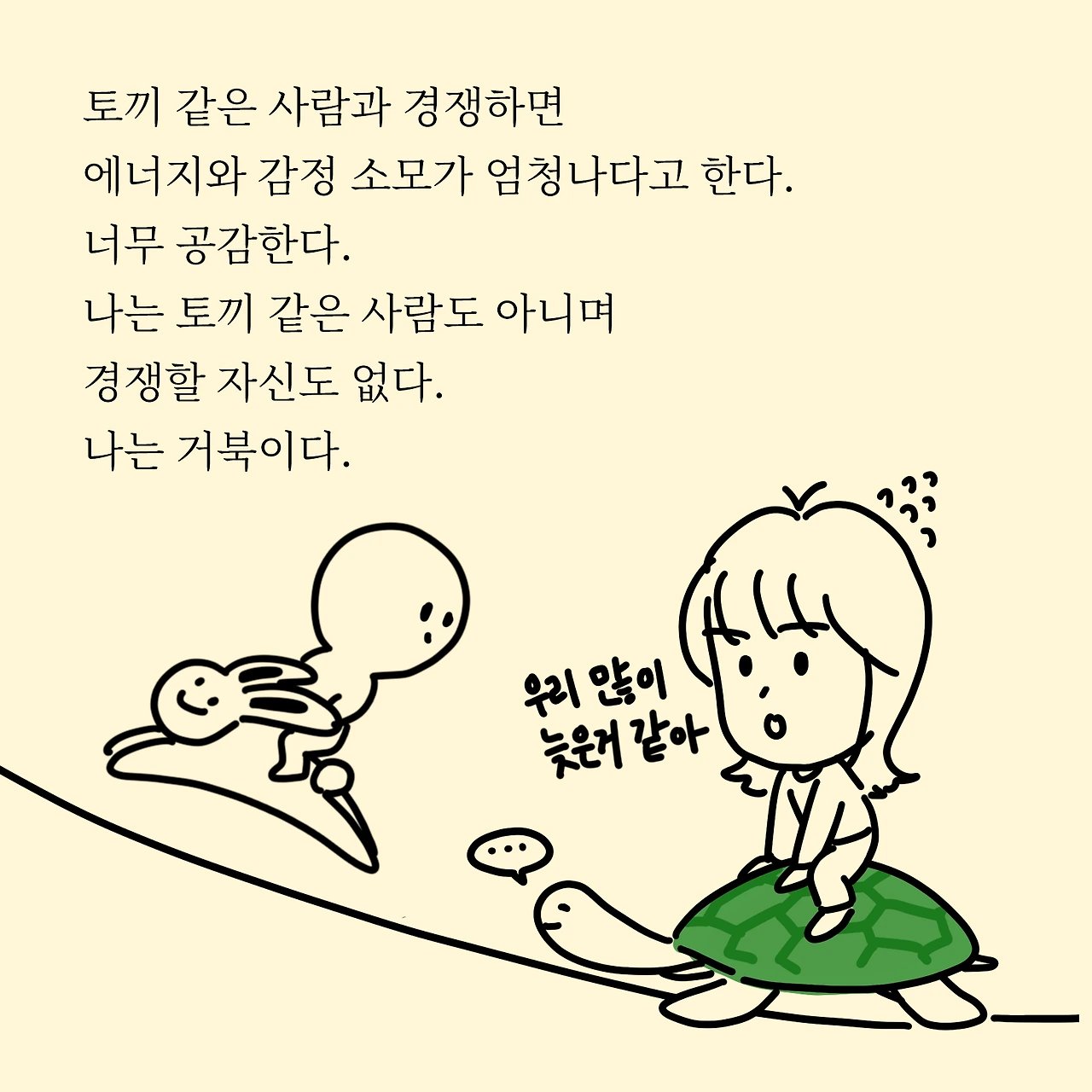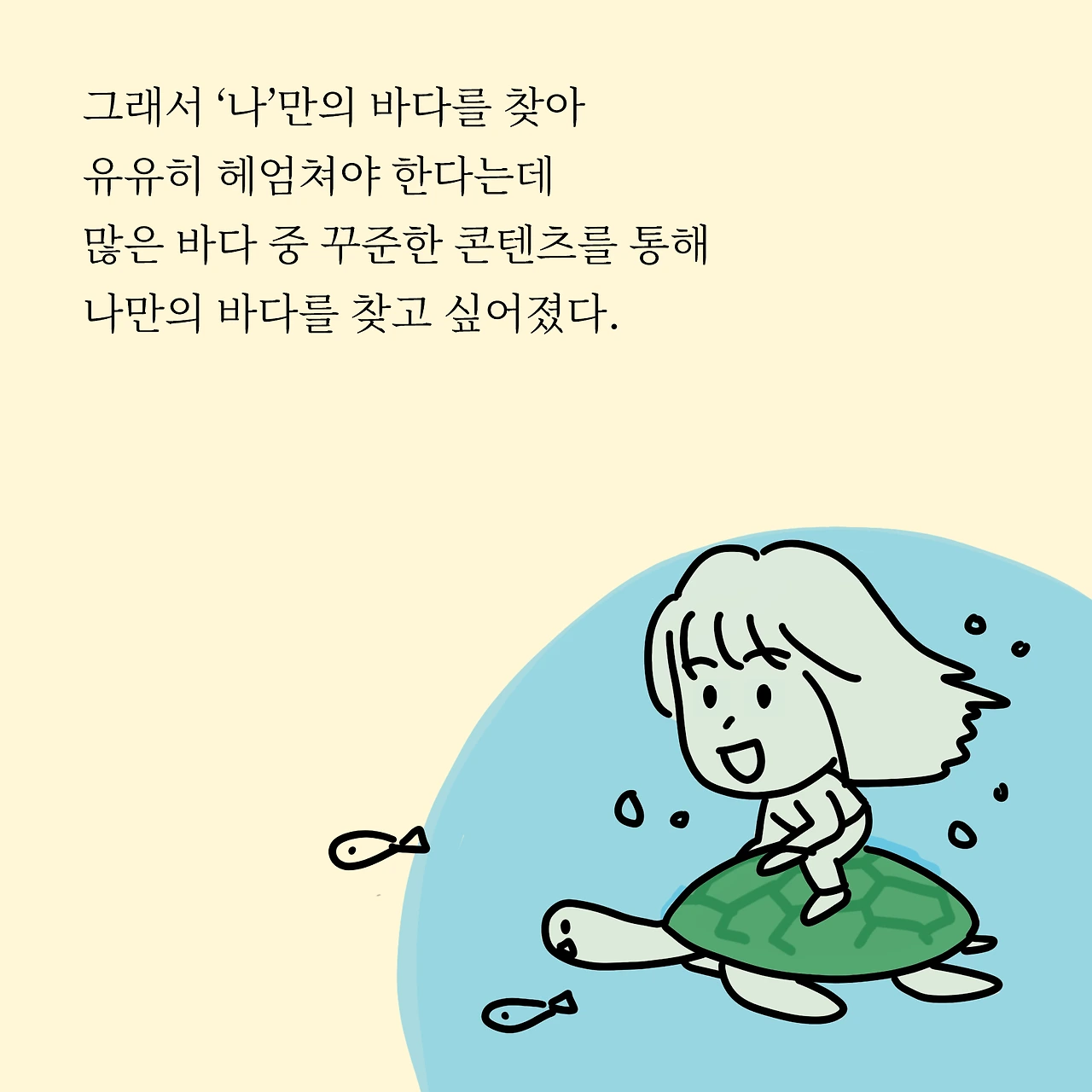 유튜버든, 인스타툰이든, 글이든 제대로 해보기 전까지는 아무도 모르는거 같습니다. 그래서 꾸준히 하는게 중요하고 혹시나 반응이 없다고 자신감이 없어지더라도 이겨내 또 도전하다보면 내공이 쌓인다고 합니다. 혹시 콘텐츠 만들고 싶은데 어떤 컨셉으로 콘텐츠를 만들지 고민이신 분들은 우선 현재를 기록하는 것 부터 시작하라고 하네요~저 같은 거북이 어디 또 계신가요?우리 유유히 헤엄쳐보아요!