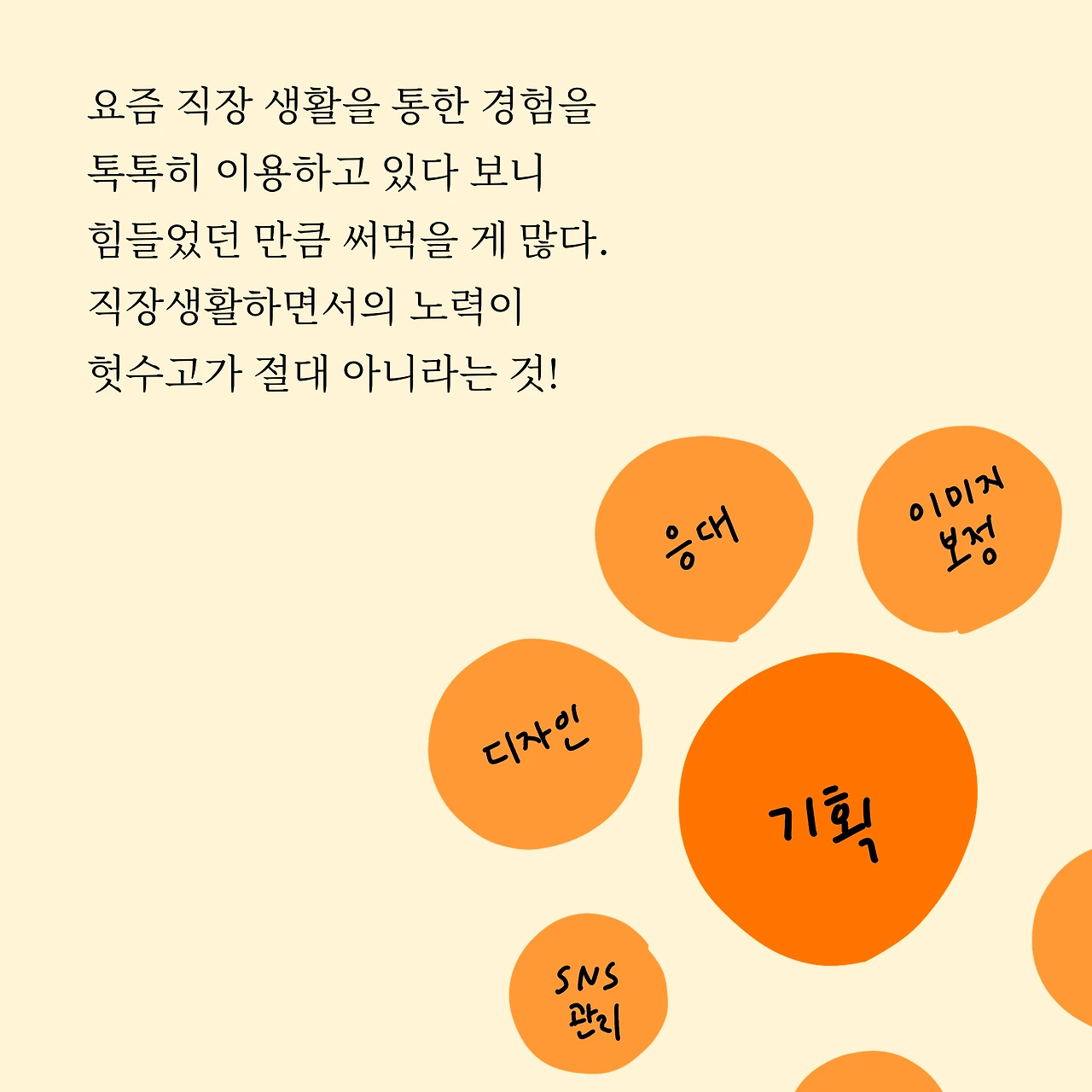요즘 직장 생활을 통한 경험을 톡톡히 이용하고 있다 보니 힘들었던 만큼 써먹을 게 많다. 직장 생활하면서의 노력이 헛수고가 절대 아니라는 것!