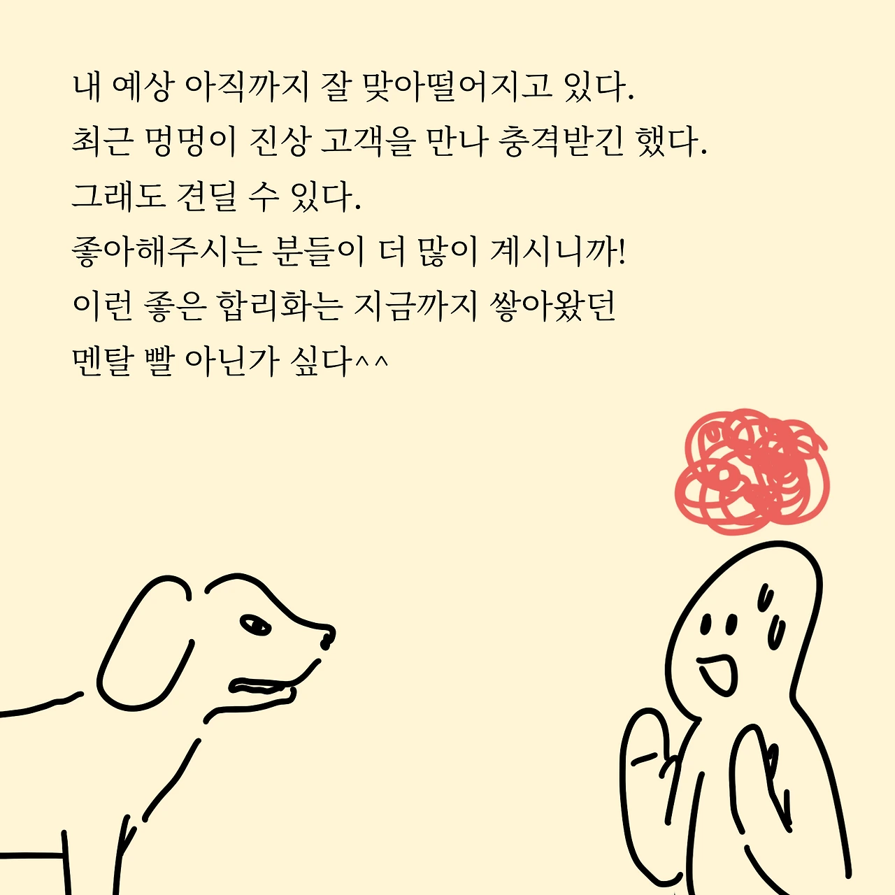 내 예상 아직까지 잘 맞아떨어지고 있다. 최근 멍멍이 진상 고객을 만나 충격받긴 했지만.. 그래도 견딜 수 있다. 좋아해 주시는 분들이 더 많이 계시니까! 이런 좋은 합리화는 지금까지 쌓아왔던 멘탈 빨 아닌가 싶다.