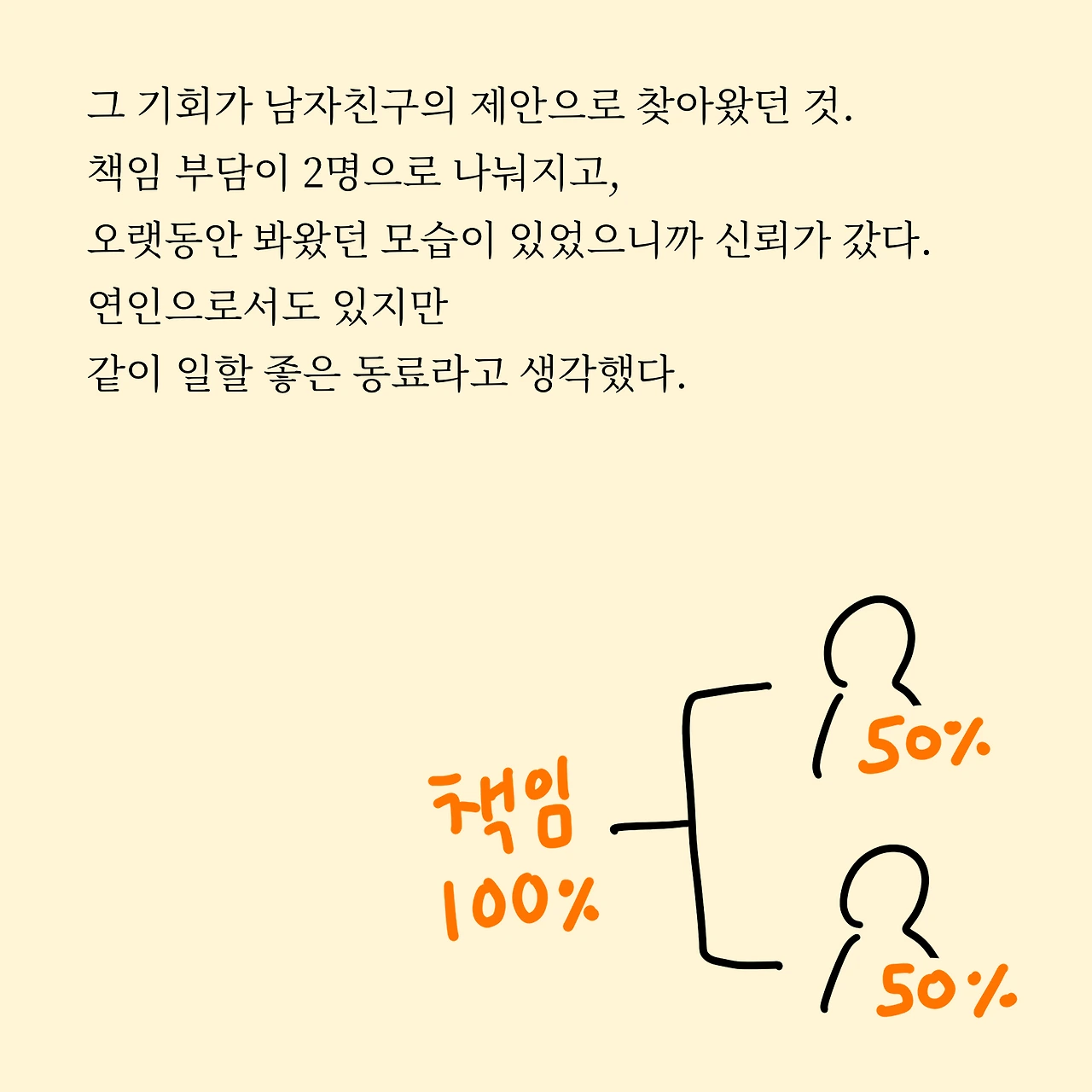 그 기회가 남자친구의 제안으로 찾아왔던 것. 책임 부담이 2명으로 나눠지고, 오랫동안 봐왔던 모습이 있었으니 신뢰가 갔다. 연인으로서도 있지만 같이 일할 좋은 동료라고 생각했다.